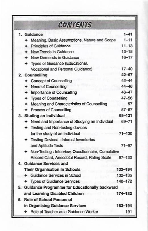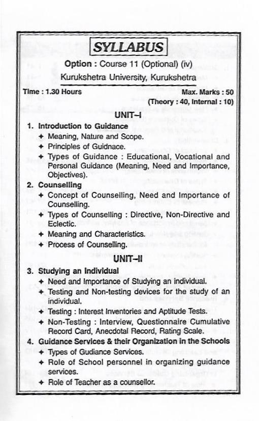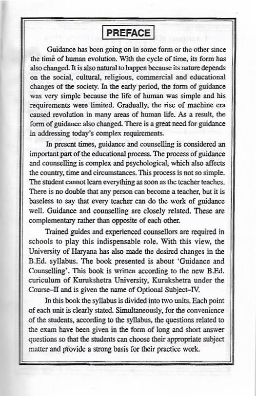 Trained guides and experienced counsellors are required in schools to play this indispensable role. With this view, the University of Haryana has also made the desired changes in the B.Ed. syllabus. The book presented is about ‘Guidance and Counselling’. This book is written according to the new B.Ed. the curriculum of Kurukshetra University, Kurukshetra under Course II and is given the name of Optional Subject-IV.