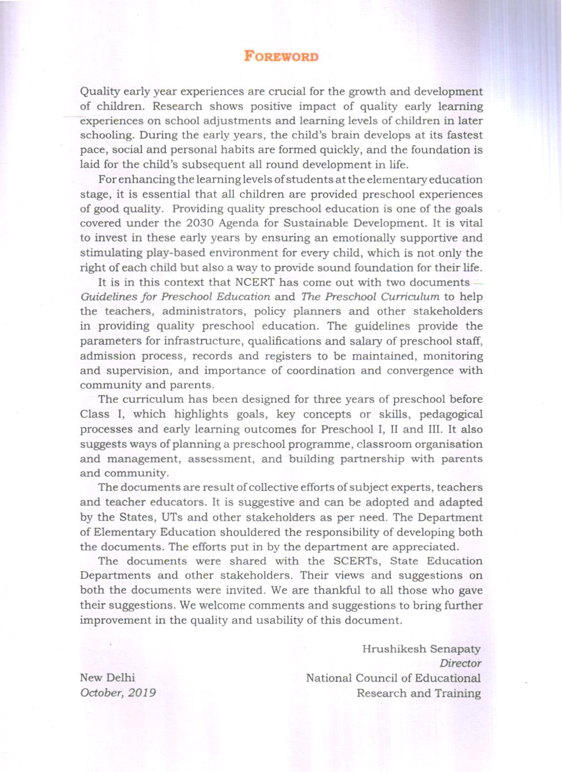 For enhancing the learning levels of students at the elementary education stage, it is essential that all children are provided preschool experiences of good quality. Providing quality preschool education is one of the goals covered under the 2030 Agenda for Sustainable Development. It is vital to invest in these early years by ensuring an emotionally supportive and stimulating play-based environment for every child, which is not only the right of each child but also a way to provide sound foundation for their life.