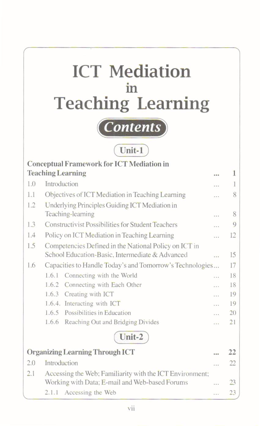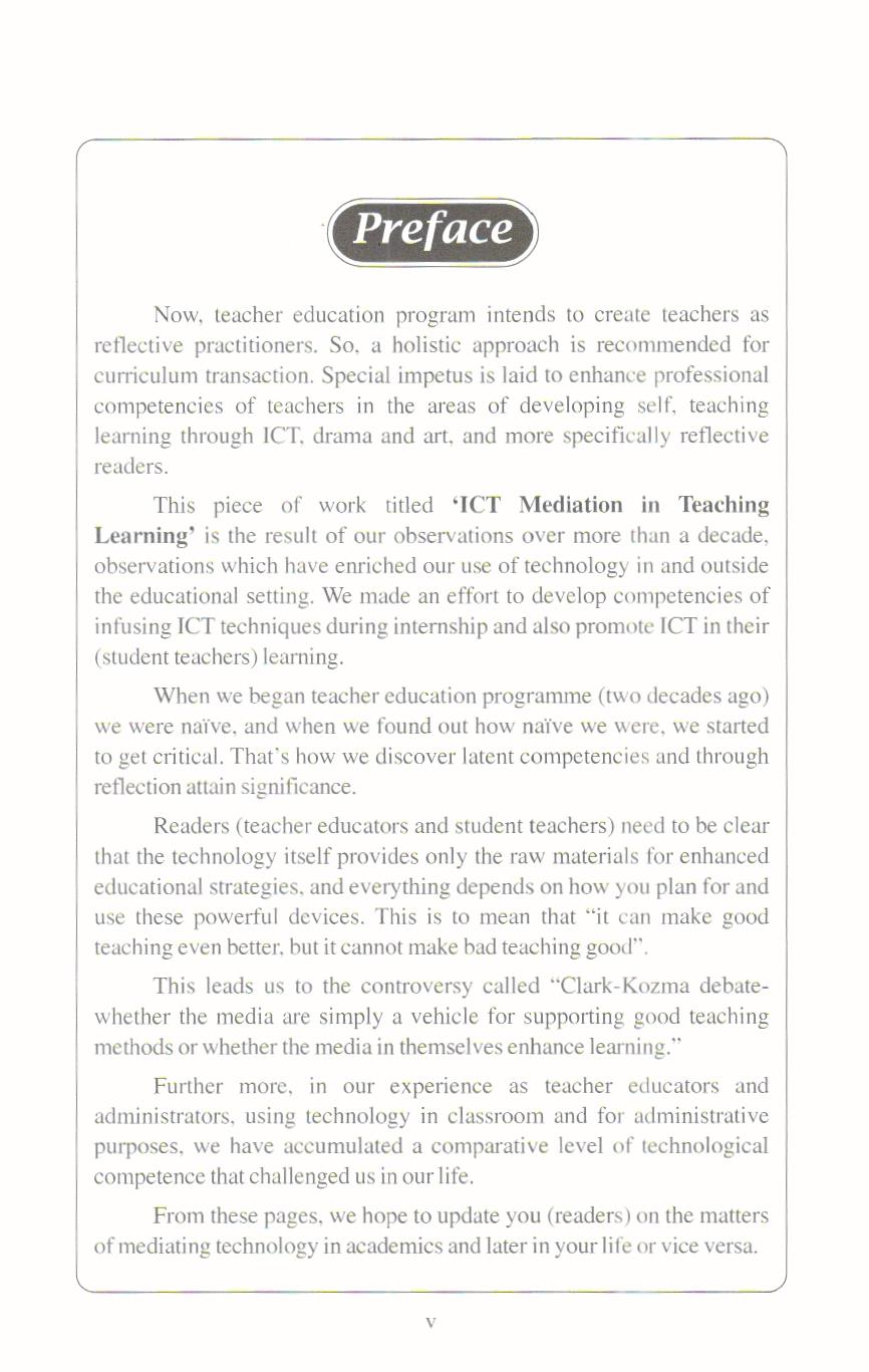 This piece of work titled ‘ICT Mediation in Teaching Learning’ is the result of our observations over more than a decade, observations which have enriched our use of technology in and outside the educational setting. We made an effort to develop competencies of infusing ICT techniques during internship and also promote ICT in their (student teachers) learning.