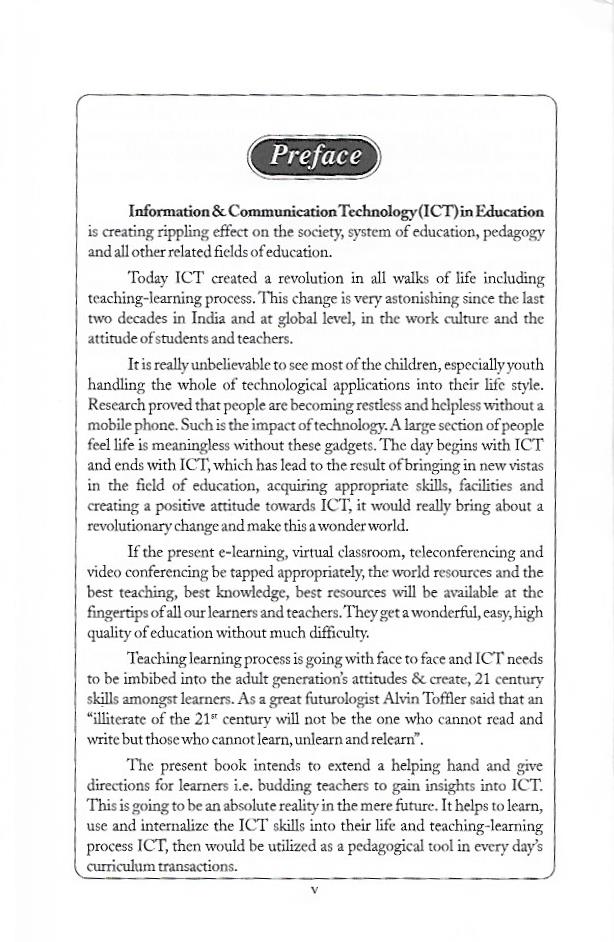 The present book intends to extend a helping hand and give directions for learners i.e. budding teachers to gain insights into ICT. This is going to be an absolute reality in the mere future. It helps to learn, use and internalize the ICT skills into their life and teaching-learning process ICT, then would be utilized as a pedagogical tool in every day’s curriculum transactions.
