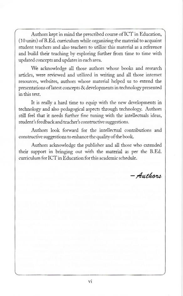 Authors acknowledge the publisher and all those who extended their support in bringing out with the material as per the B.Ed. curriculum for ICT in Education for this academic schedule.