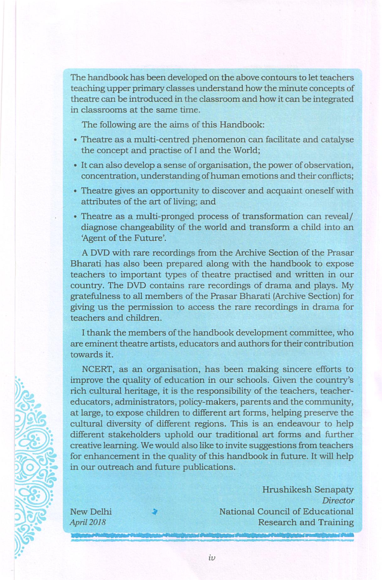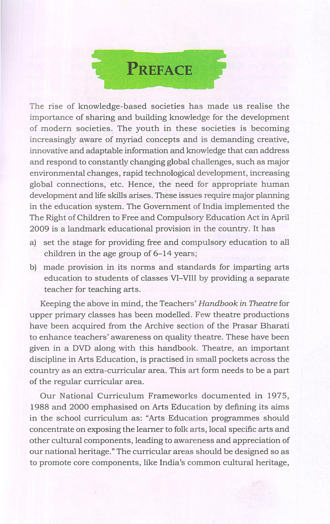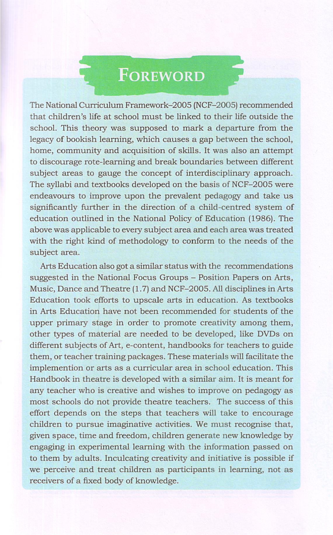 Arts Education also got a similar status with the recommendations suggested in the National Focus Groups – Position Papers on Arts, Music, Dance and Theatre (1.7) and NCF-2005. All disciplines in Arts Education made efforts to upscale arts in education. As textbooks in Arts Education have not been recommended for students of the upper primary stage in order to promote creativity among them, other types of material needed to be developed, like DVDs on different subjects of Art, e-content, handbooks for teachers to guide them, or teacher training packages. These materials will facilitate the implementation of arts as a curricular area in school education. This Handbook in theatre is developed with a similar aim. It is meant for any teacher who is creative and wishes to improve on pedagogy, as most schools do not provide theatre teachers. The success of this effort depends on the steps that teachers will take to encourage children to pursue imaginative activities. We must recognise that given space, time and freedom, children generate new knowledge by engaging in experimental learning with the information passed on to them by adults. Inculcating creativity and initiative is possible if we perceive and treat children as participants in learning, not as receivers of a fixed body of knowledge.