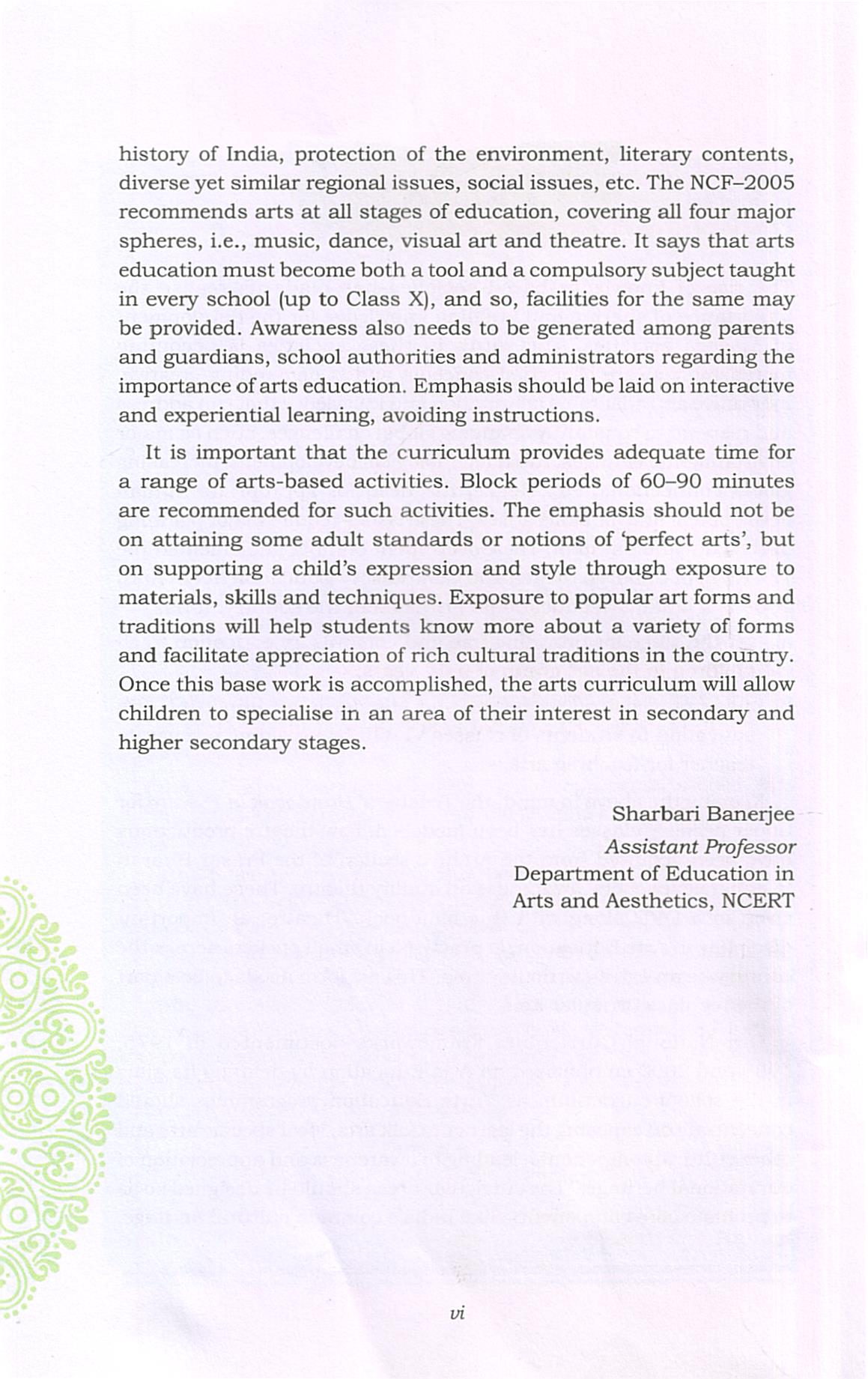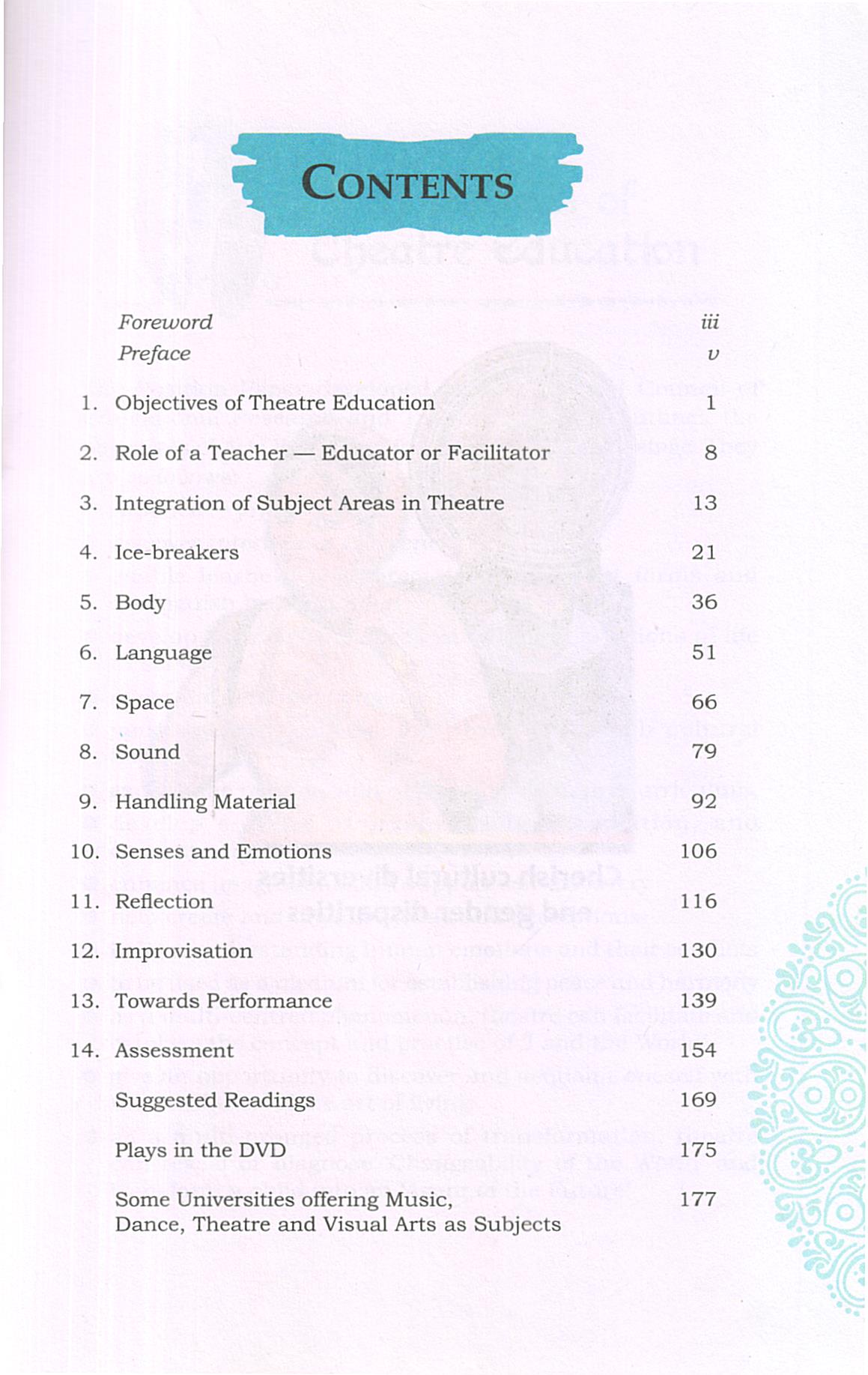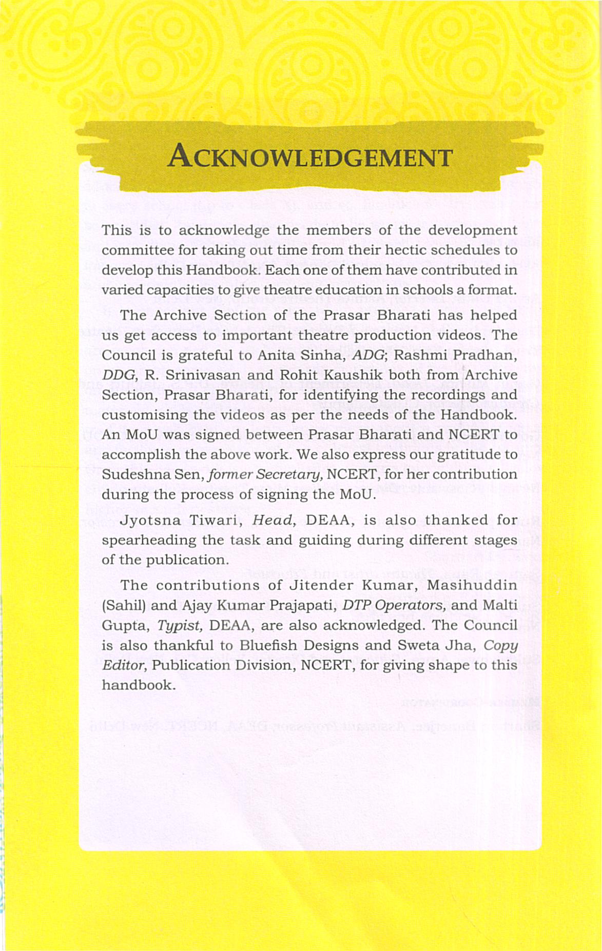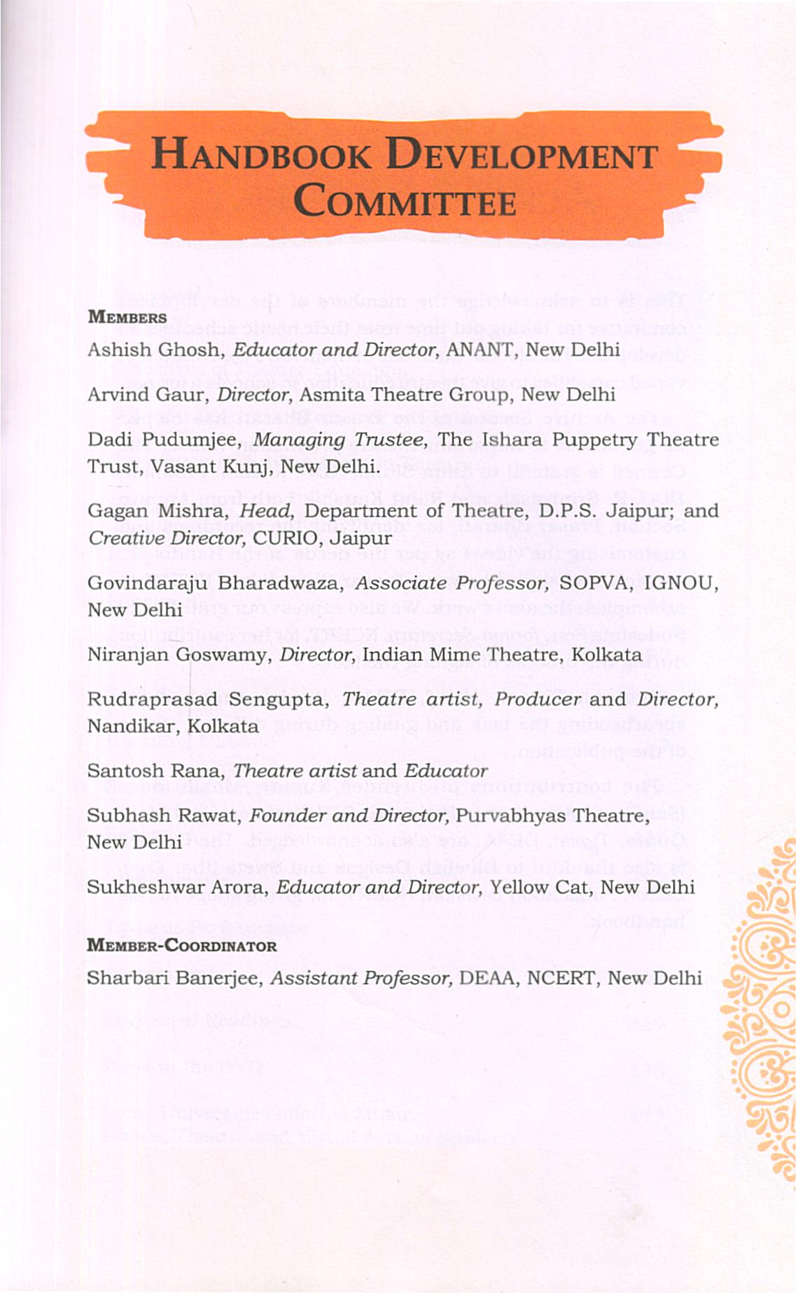 Arts Education also got a similar status with the recommendations suggested in the National Focus Groups – Position Papers on Arts, Music, Dance and Theatre (1.7) and NCF-2005. All disciplines in Arts Education made efforts to upscale arts in education. As textbooks in Arts Education have not been recommended for students of the upper primary stage in order to promote creativity among them, other types of material needed to be developed, like DVDs on different subjects of Art, e-content, handbooks for teachers to guide them, or teacher training packages. These materials will facilitate the implementation of arts as a curricular area in school education. This Handbook in theatre is developed with a similar aim. It is meant for any teacher who is creative and wishes to improve on pedagogy, as most schools do not provide theatre teachers. The success of this effort depends on the steps that teachers will take to encourage children to pursue imaginative activities. We must recognise that given space, time and freedom, children generate new knowledge by engaging in experimental learning with the information passed on to them by adults. Inculcating creativity and initiative is possible if we perceive and treat children as participants in learning, not as receivers of a fixed body of knowledge.