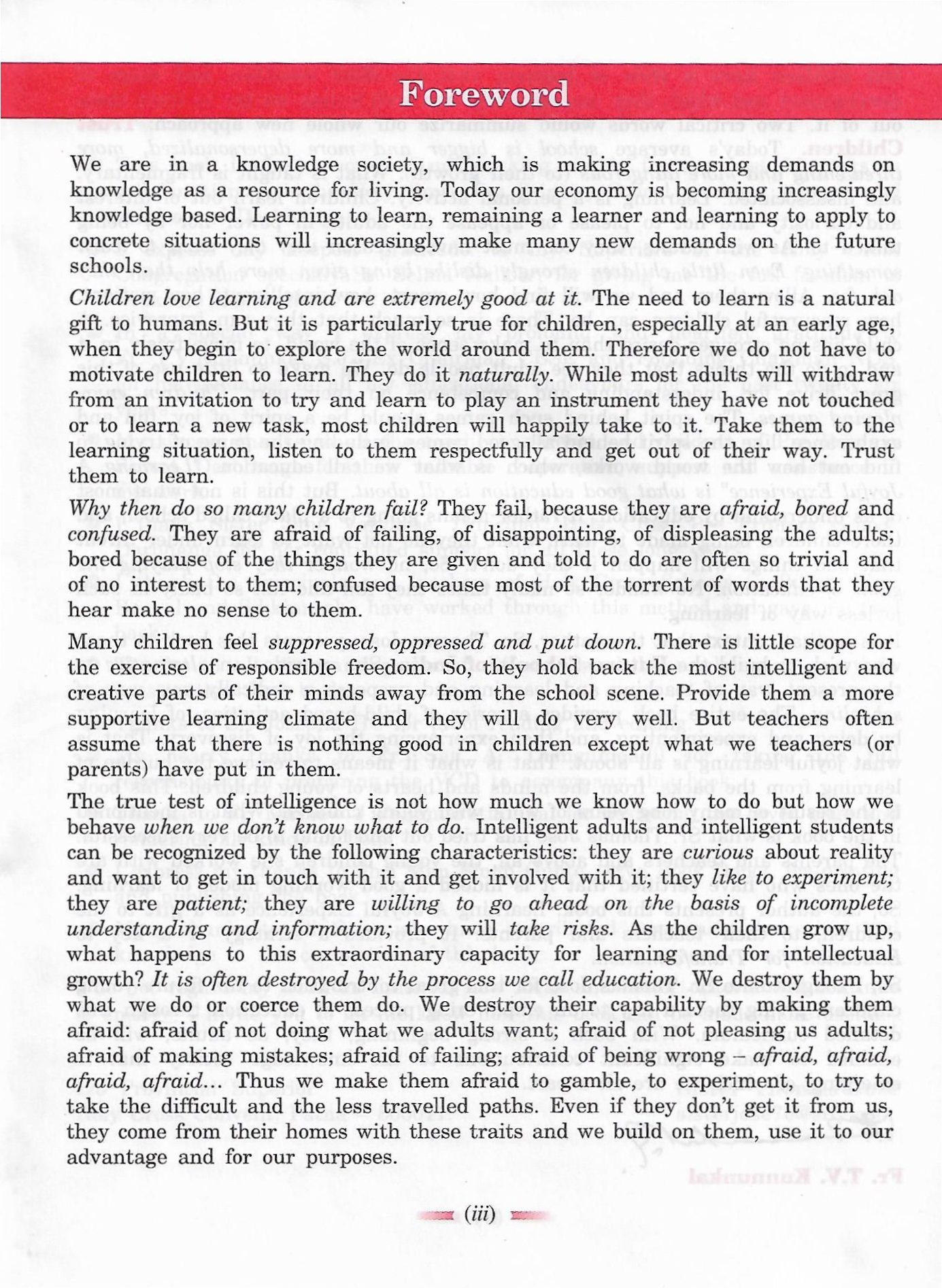 The true test of intelligence is not how much we know how to do but how we behave when we don’t know what to do. Intelligent adults and intelligent students can be recognized by the following characteristics: they are curious about reality and want to get in touch with it and get involved with it; they like to experiment; they are patient; they are willing to go ahead on the basis of incomplete understanding and information; they will take risks. As the children grow up, what happens to this extraordinary capacity for learning and for intellectual growth? It is often destroyed by the process we call education. We destroy them by what we do or coerce them to do. We ruin their capability by making them afraid: afraid of not doing what we adults want; afraid of not pleasing us adults, afraid of making mistakes; afraid of failing, afraid of being wrong afraid, afraid, afraid, afraid… Thus we make them afraid to gamble, experiment, and take the difficult and the less travelled paths. Even if they don’t get it from us, they come from their homes with these traits and we build on them and use them to our advantage and for our purposes.