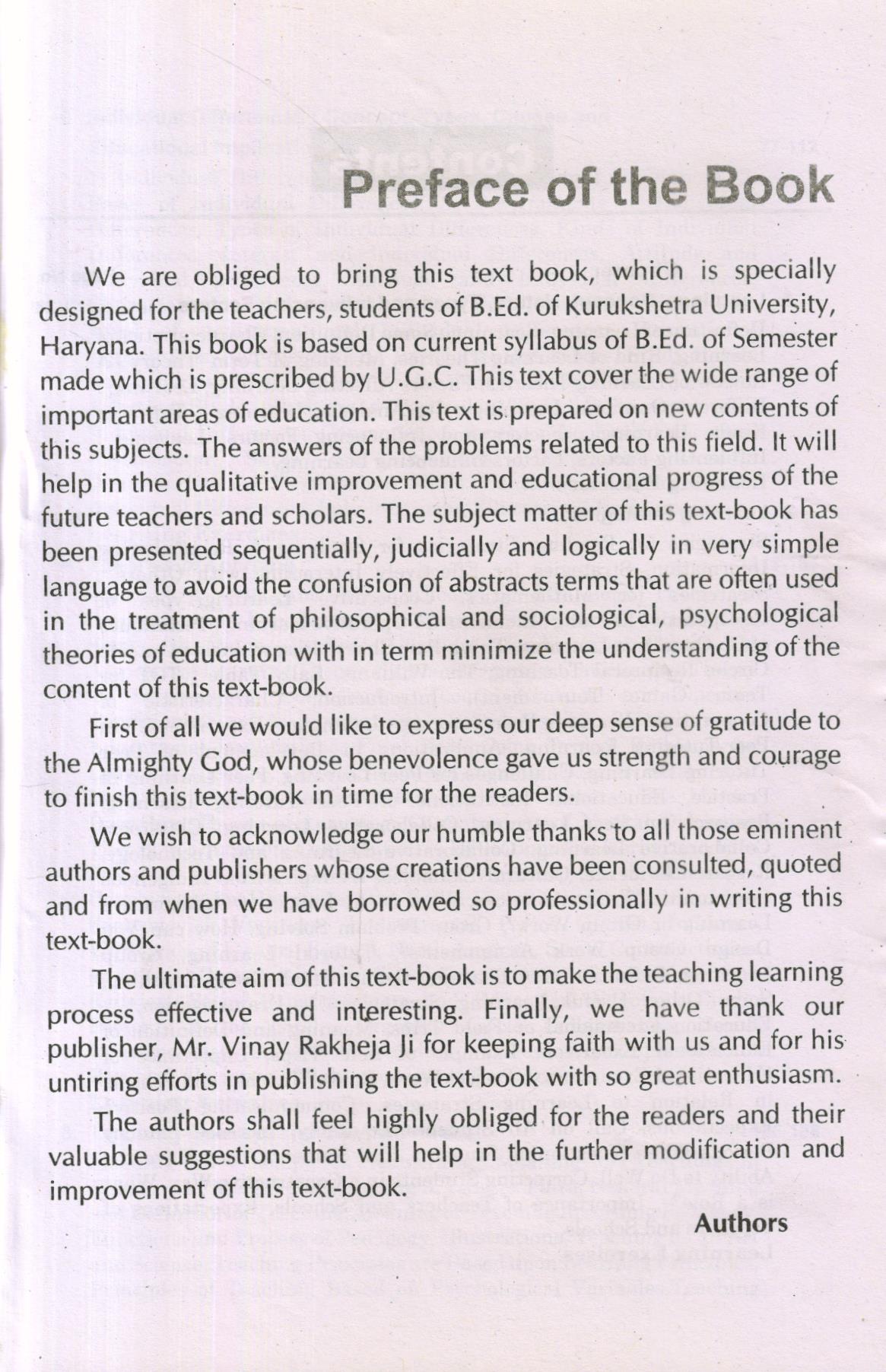 We are obliged to bring this text book, which is specially designed for the teachers, students of B.Ed. of Kurukshetra University, Haryana. This book is based on current syllabus of B.Ed. of Semester made which is prescribed by U.G.C. This text cover the wide range of important areas of education. This text is prepared on new contents of this subjects. The answers of the problems related to this field. It will help in the qualitative improvement and educational progress of the future teachers and scholars. The subject matter of this text-book has been presented sequentially, judicially and logically in very simple language to avoid the confusion of abstracts terms that are often used in the treatment of philosophical and sociological, psychological theories of education with in term minimize the understanding of the content of this text-book.