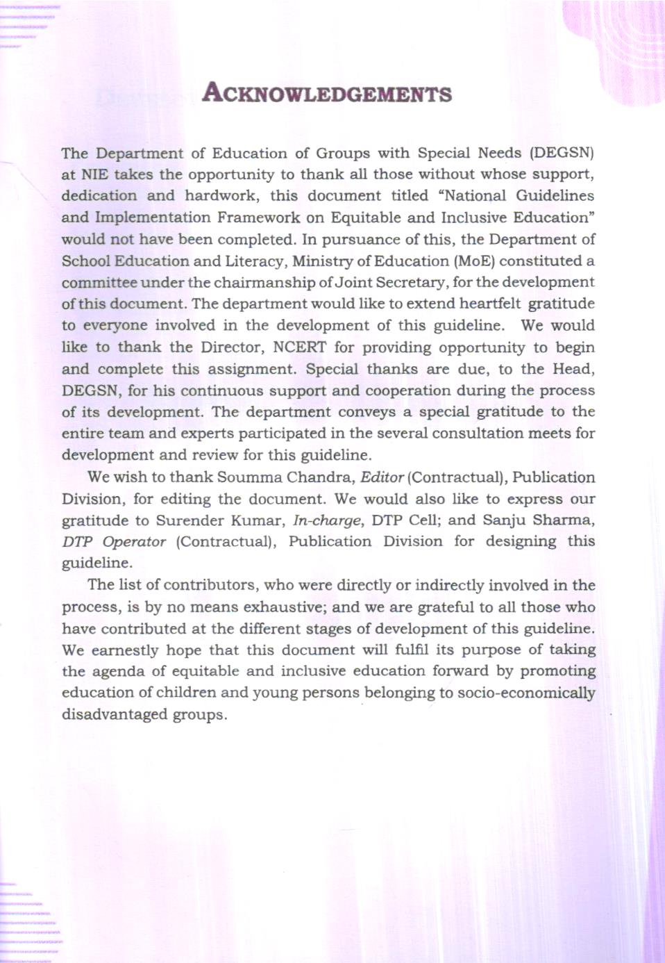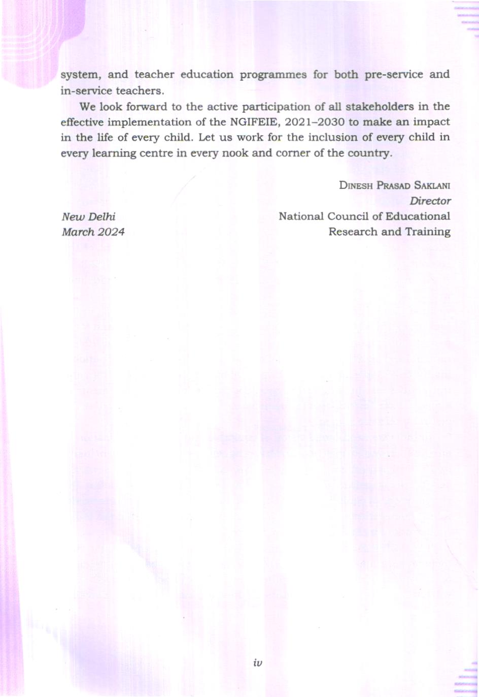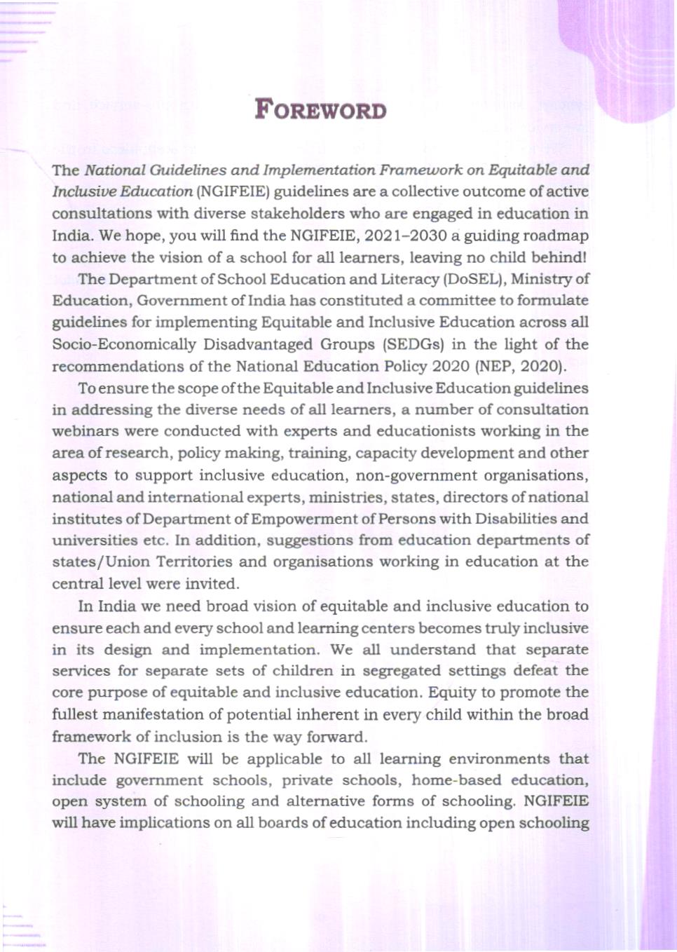 The National Guidelines and Implementation Framework on Equitable and Inclusive Education (NGIFEIE) guidelines are a collective outcome of active consultations with diverse stakeholders who are engaged in education in India. We hope, you will find the NGIFEIE, 2021-2030 a guiding roadmap to achieve the vision of a school for all learners, leaving no child behind!