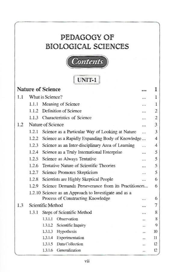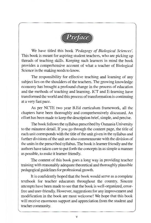 We have titled this book ‘Pedagogy of Biological Sciences’. This book is meant for aspiring student teachers, who are picking up threads of teaching skills. Keeping such learners in mind the book provides a comprehensive account of what a teacher of Biological Science in the making needs to know.