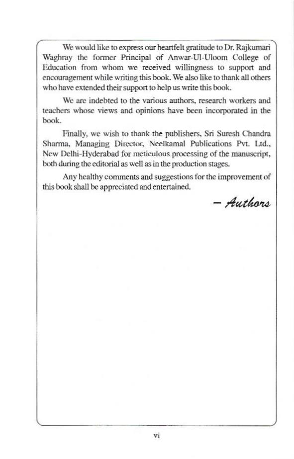 It is confidently hoped that the book would serve as a complete textbook for teacher educators throughout the country. Sincere attempts have been made to see that the book is well-organized, error- free and user-friendly. However, suggestions for any improvement and modification in the book are most welcome! We hope that this book will receive enormous support and appreciation from the student and teacher community.
