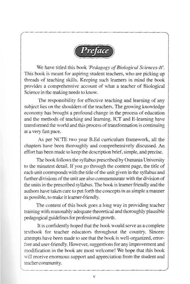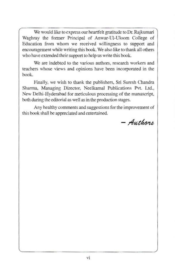 It is confidently hoped that the book would serve as a complete textbook for teacher educators throughout the country. Sincere attempts have been made to see that the book is well-organized, error- free and user-friendly. However, suggestions for any improvement and modification in the book are most welcome! We hope that this book will receive enormous support and appreciation from the student and teacher community.