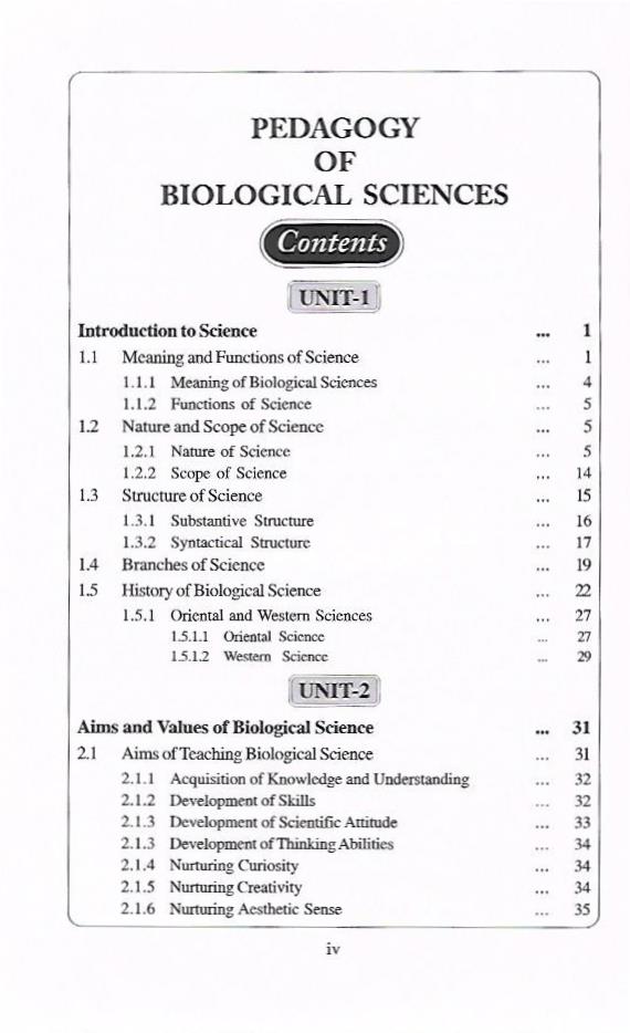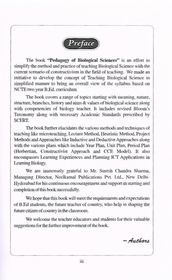 The book “Pedagogy of Biological Sciences” is an effort to simplify the method and practice of teaching Biological Science with the current scenario of constructivism in the field of teaching. We made an initiative to develop the concept of Teaching Biological Science in simplified manner to bring an overall view of the syllabus based on NCTE two year B.Ed. curriculum
