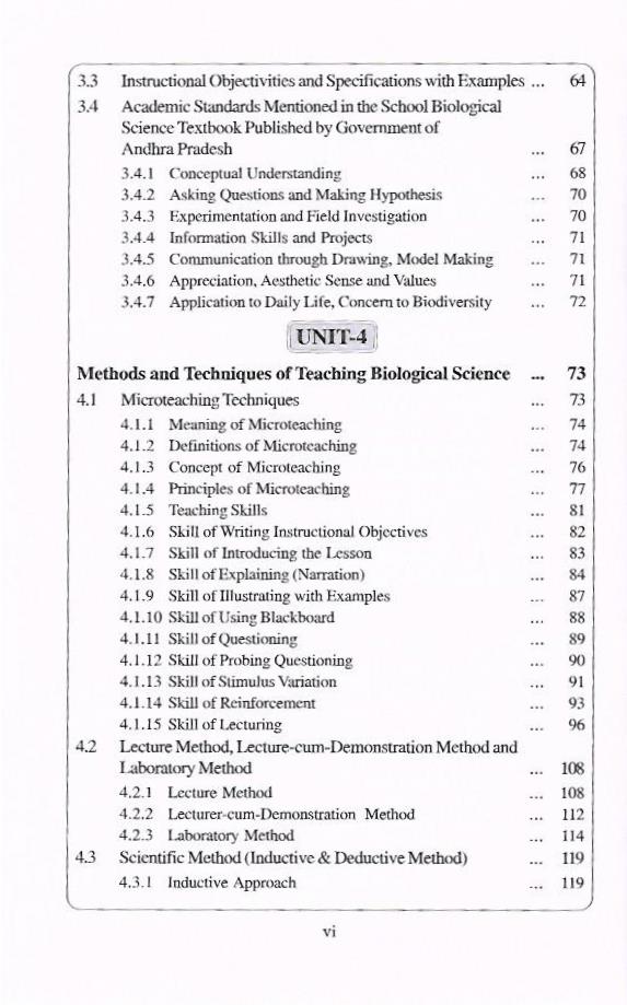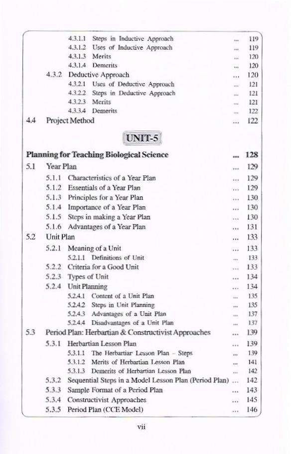 The book further elucidates the various methods and techniques of teaching like microteaching, Lecture Method, Heuristic Method, Project Methods and Approaches like Inductive and Deductive Approaches along with the various plans which include Year Plan, Unit Plan, Period Plan (Herbertian, Constructivist Approach and CCE Model). It also encompasses Learning Experiences and Planning ICT Applications in Learning Biology.