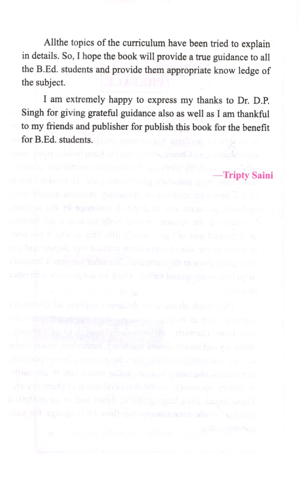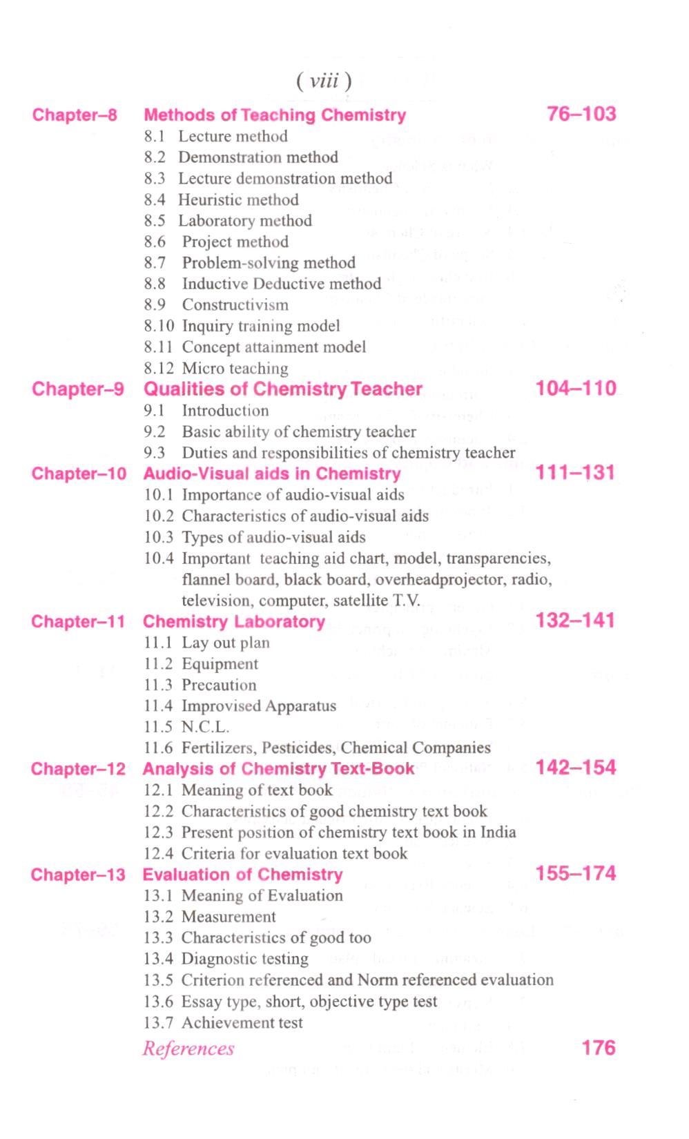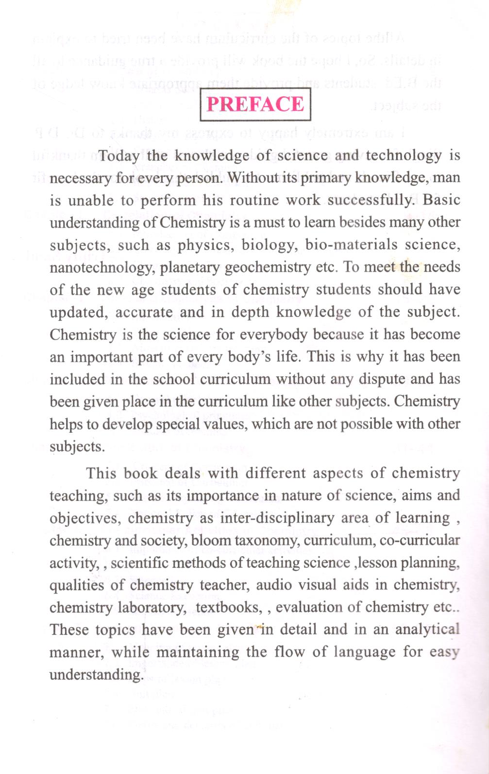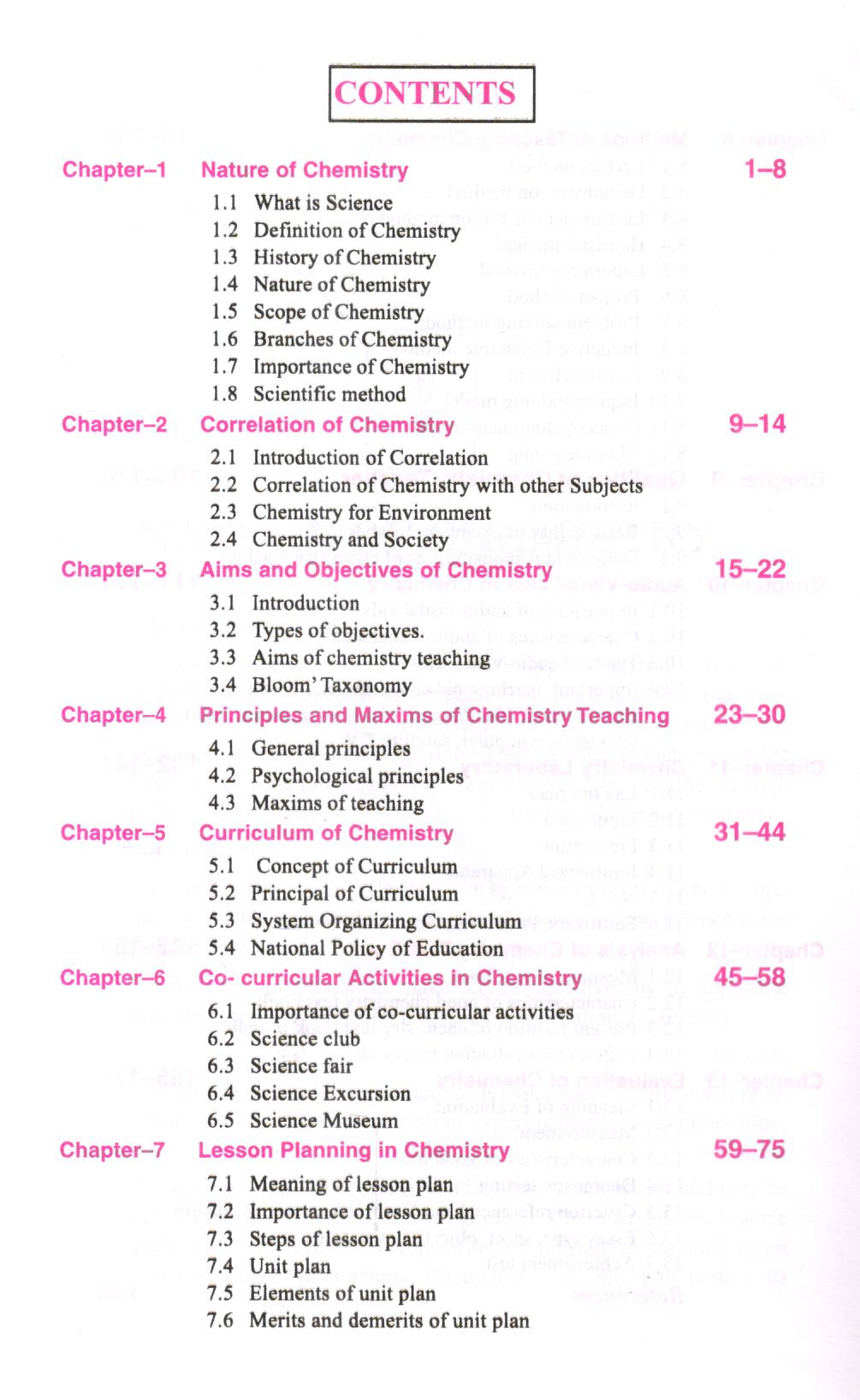 This book deals with different aspects of chemistry teaching, such as its importance in the nature of science, aims and objectives, chemistry as the inter-disciplinary area of learning, chemistry and society, bloom taxonomy, curriculum, co-curricular activity,, scientific methods of teaching science, lesson planning, qualities of a chemistry teacher, audio-visual aids in chemistry, chemistry laboratory, textbooks,, evaluation of chemistry etc.. These topics have been given in detail and in an analytical manner while maintaining the flow of language for easy understanding.