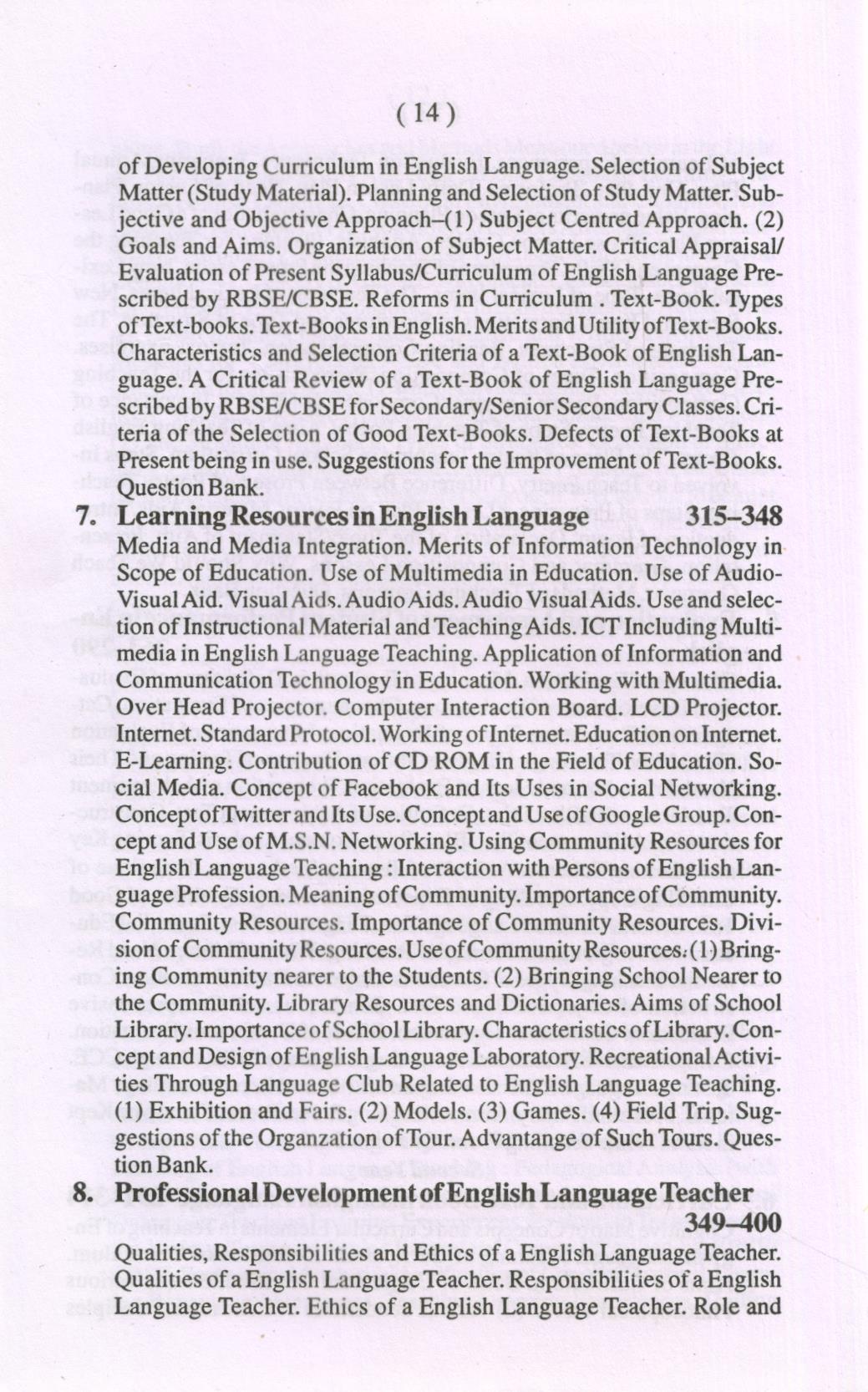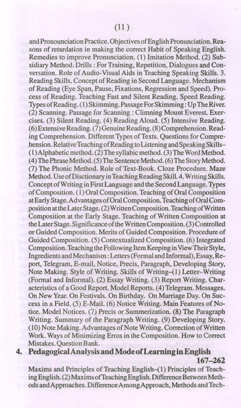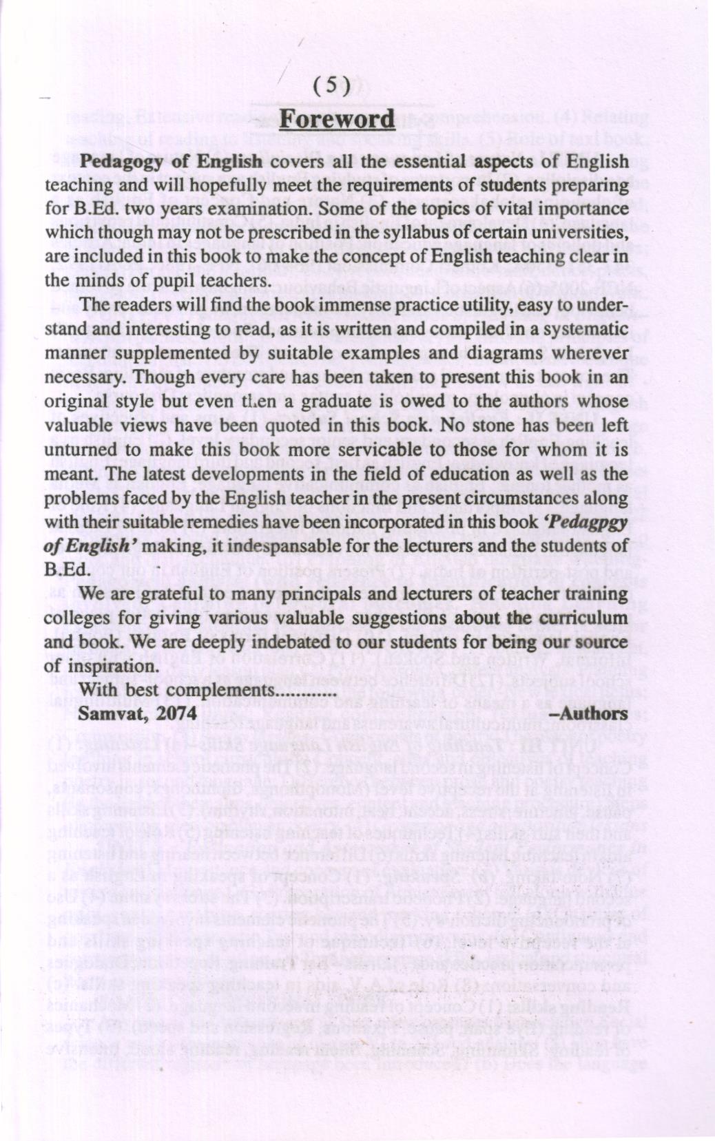 The readers will find the book immense practice utility, easy to under- stand and interesting to read, as it is written and compiled in a systematic manner supplemented by suitable examples and diagrams wherever necessary. Though every care has been taken to present this book in an original style even then a graduate is owed to the authors whose valuable views have been quoted in this book. No stone has been left unturned to make this book more serviceable to those for whom it is meant. The latest developments in the field of education, as well as the problems faced by the English teacher in the present circumstances along with their suitable remedies, have been incorporated in this book ‘Pedagogy of English’ making, it indispensable for the lecturers and the students of B.Ed.