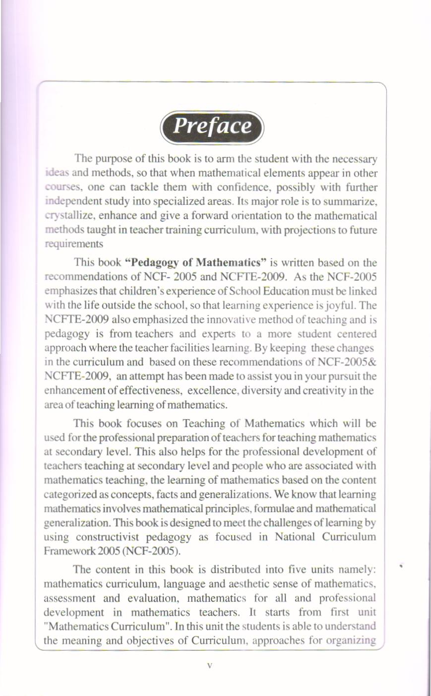 This book “Pedagogy of Mathematics” is written based on the recommendations of NCF- 2005 and NCFTE-2009. As the NCF-2005 emphasizes that children’s experience of School Education must be linked with the life outside the school, so that learning experience is joyful. The NCFTE-2009 also emphasized the innovative method of teaching and is pedagogy is from teachers and experts to a more student centered approach where the teacher facilities learning. By keeping these changes in the curriculum and based on these recommendations of NCF-2005& NCFTE-2009, an attempt has been made to assist you in your pursuit the enhancement of effectiveness, excellence, diversity and creativity in the area of teaching learning of mathematics.