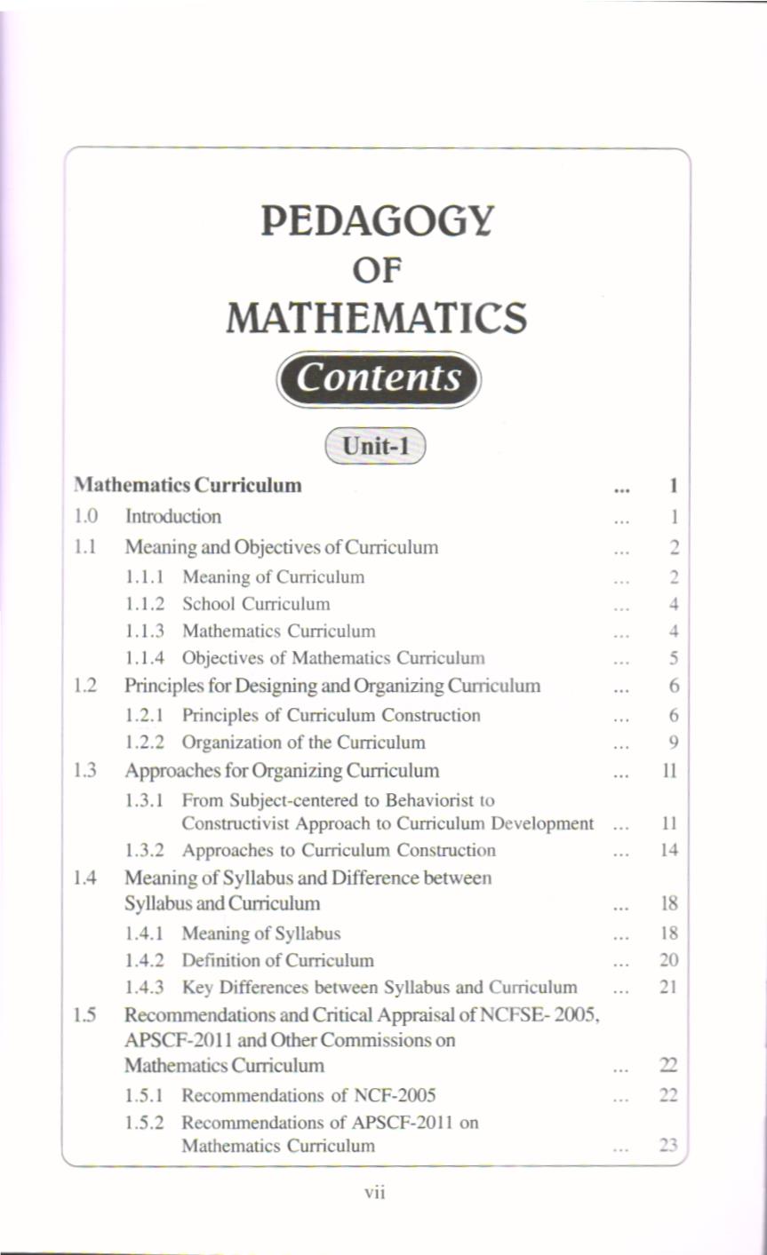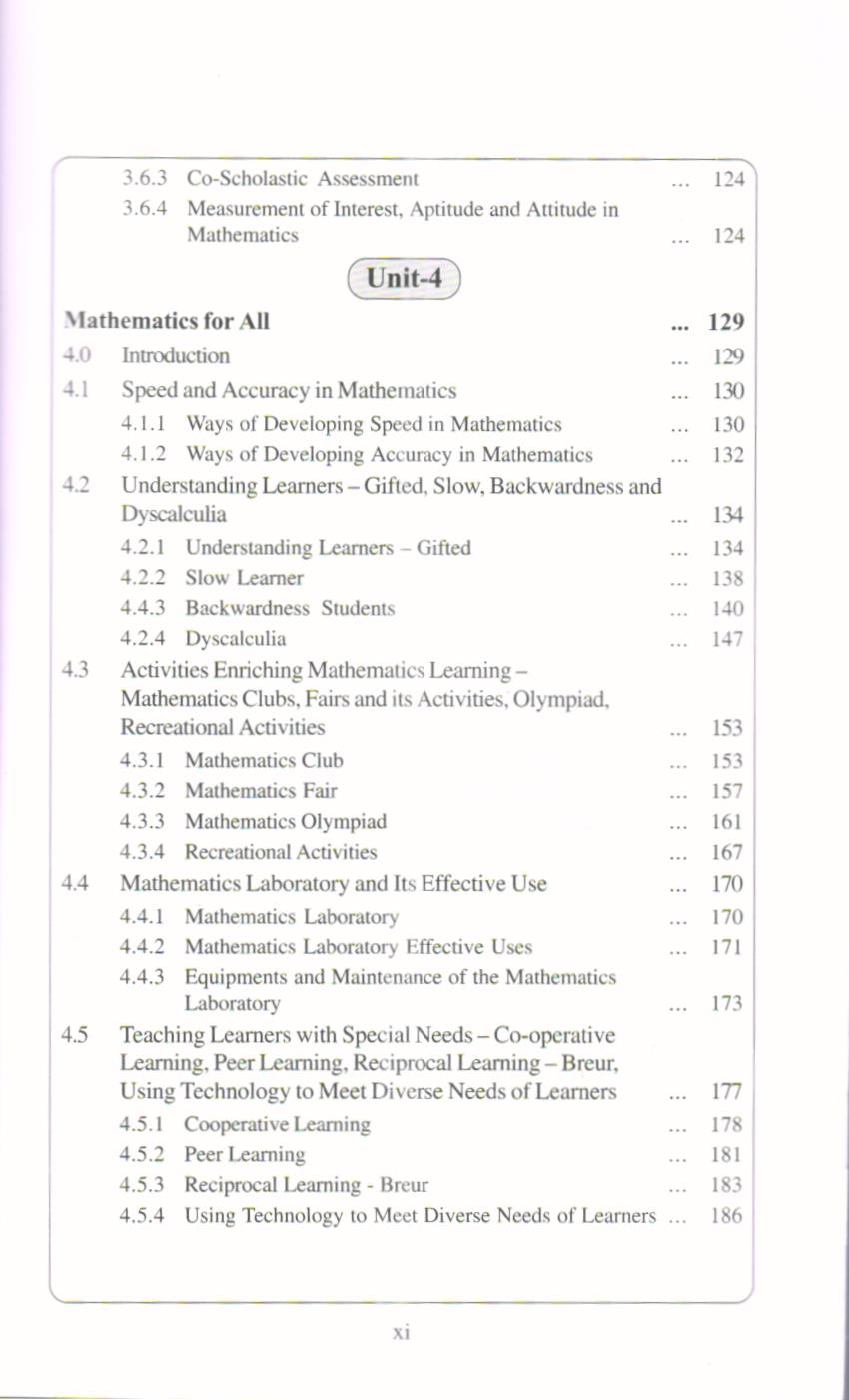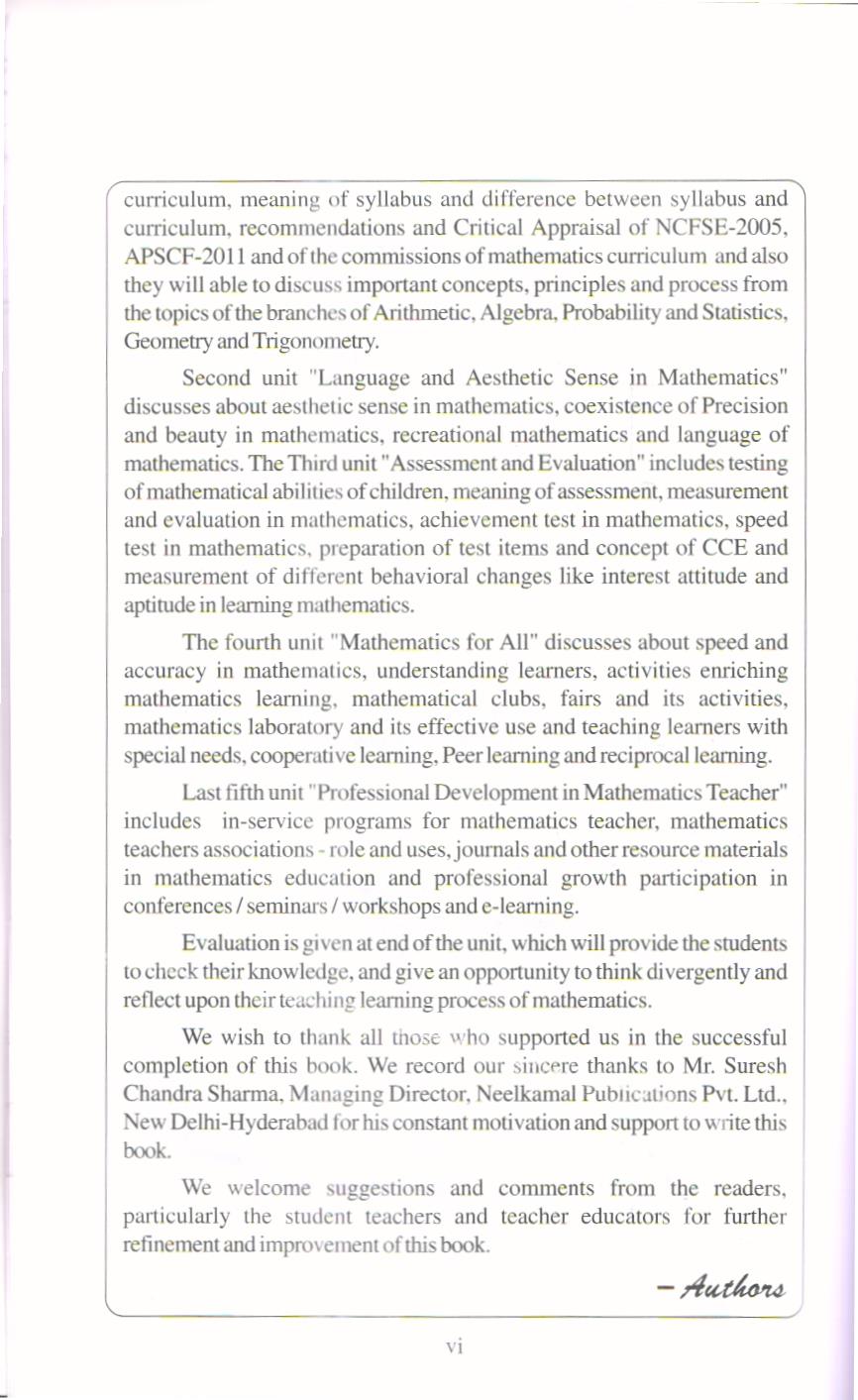 The content in this book is distributed into five units namely: mathematics curriculum, language and aesthetic sense of mathematics, assessment and evaluation, mathematics for all and professional development in mathematics teachers. It starts from first unit “Mathematics Curriculum”. In this unit the students is able to understand the meaning and objectives of Curriculum, approaches for organizing
