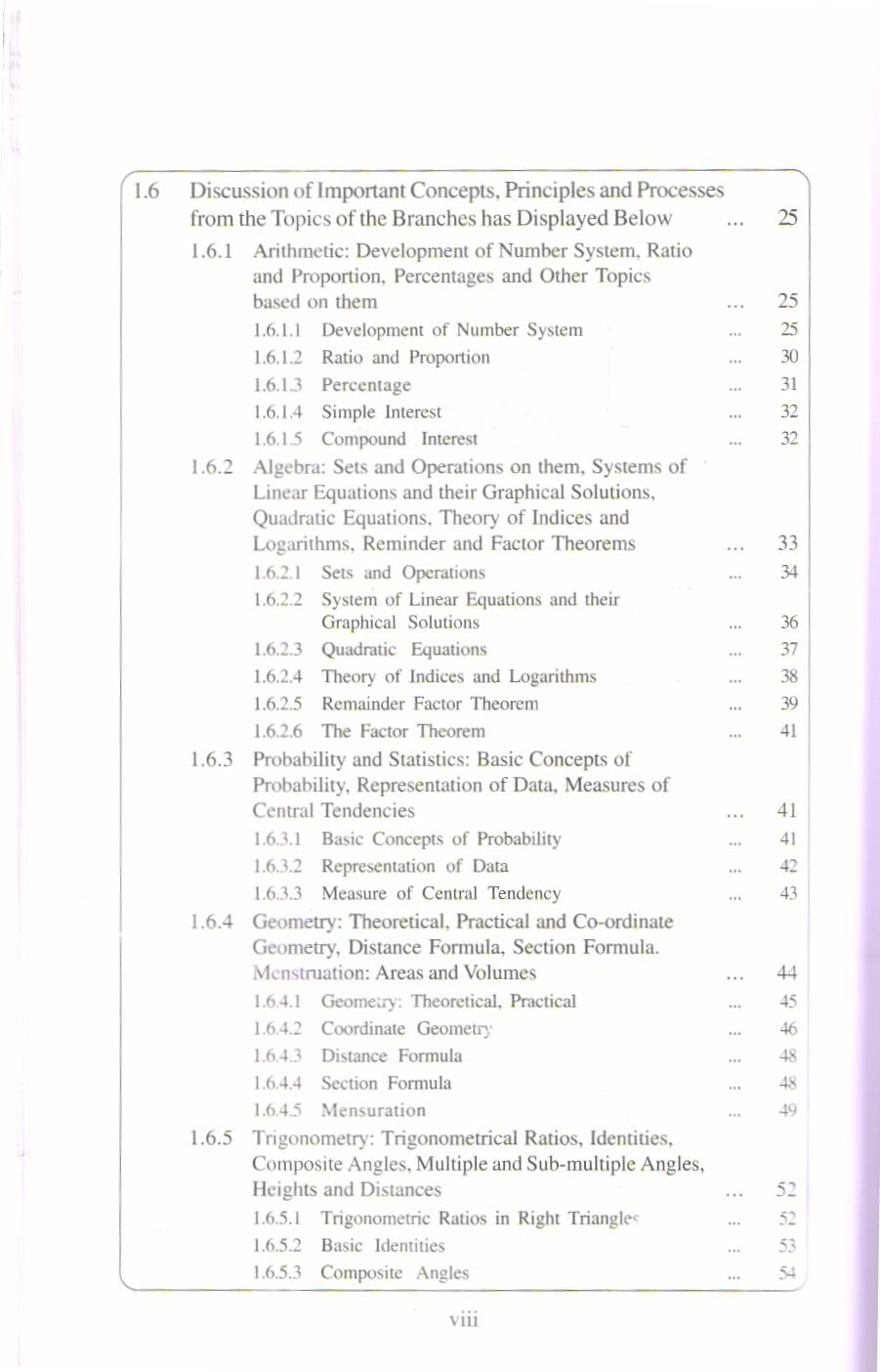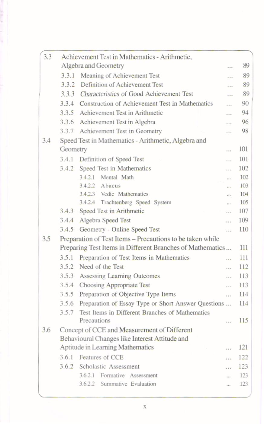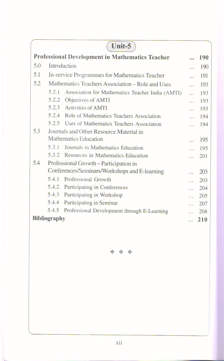 The content in this book is distributed into five units namely: mathematics curriculum, language and aesthetic sense of mathematics, assessment and evaluation, mathematics for all and professional development in mathematics teachers. It starts from first unit “Mathematics Curriculum”. In this unit the students is able to understand the meaning and objectives of Curriculum, approaches for organizing