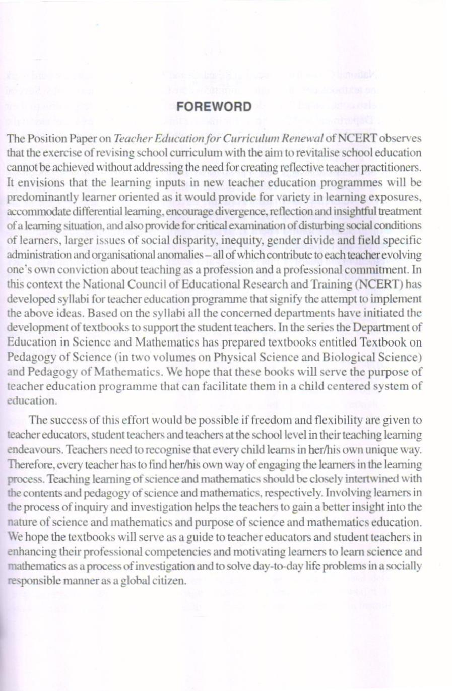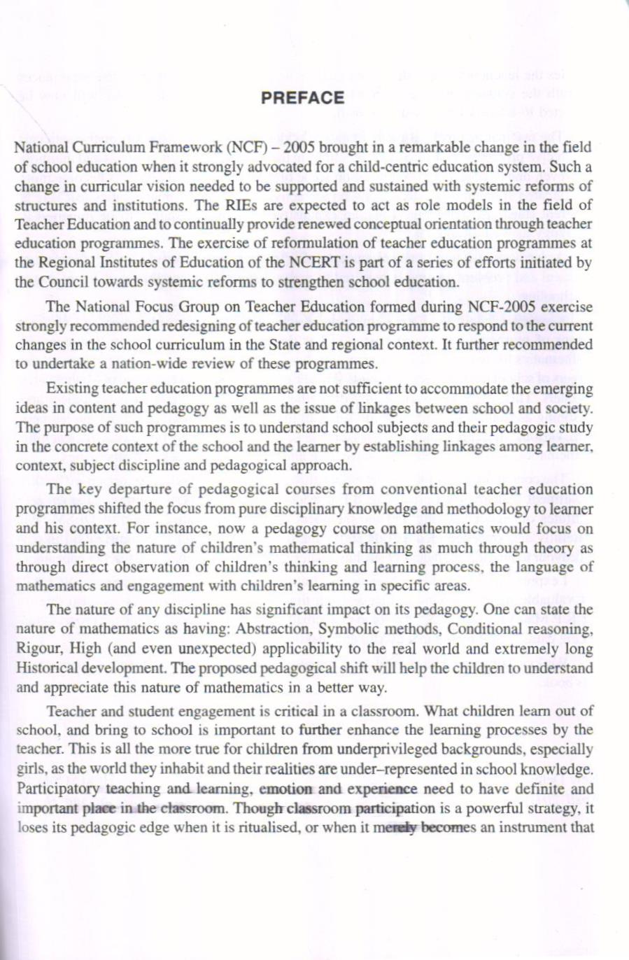 The National Focus Group on Teacher Education formed during NCF-2005 exercise strongly recommended redesigning of teacher education programme to respond to the current changes in the school curriculum in the State and regional context. It further recommended to undertake a nation-wide review of these programmes.