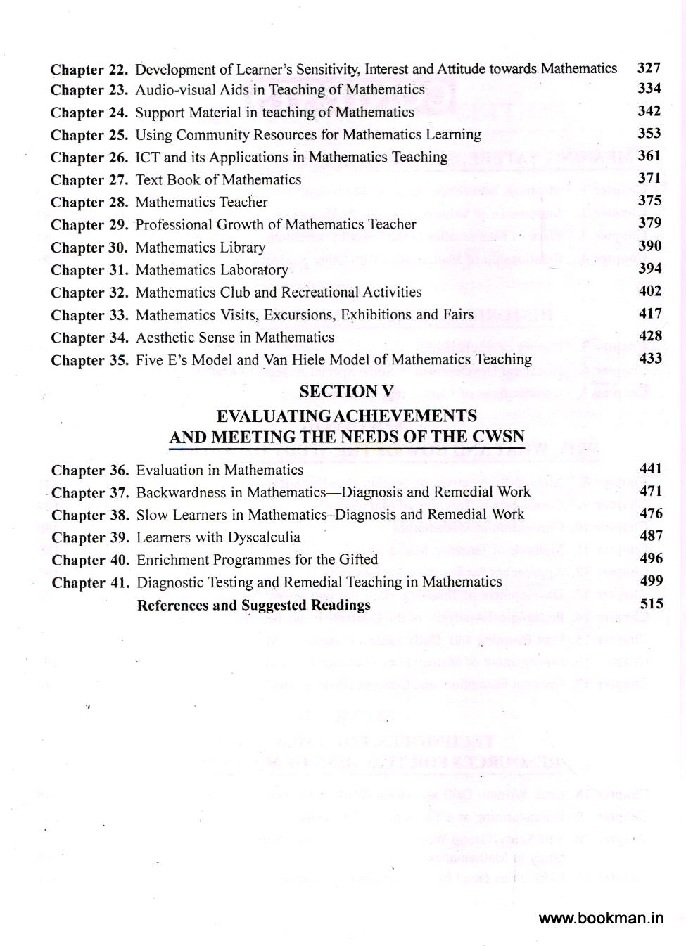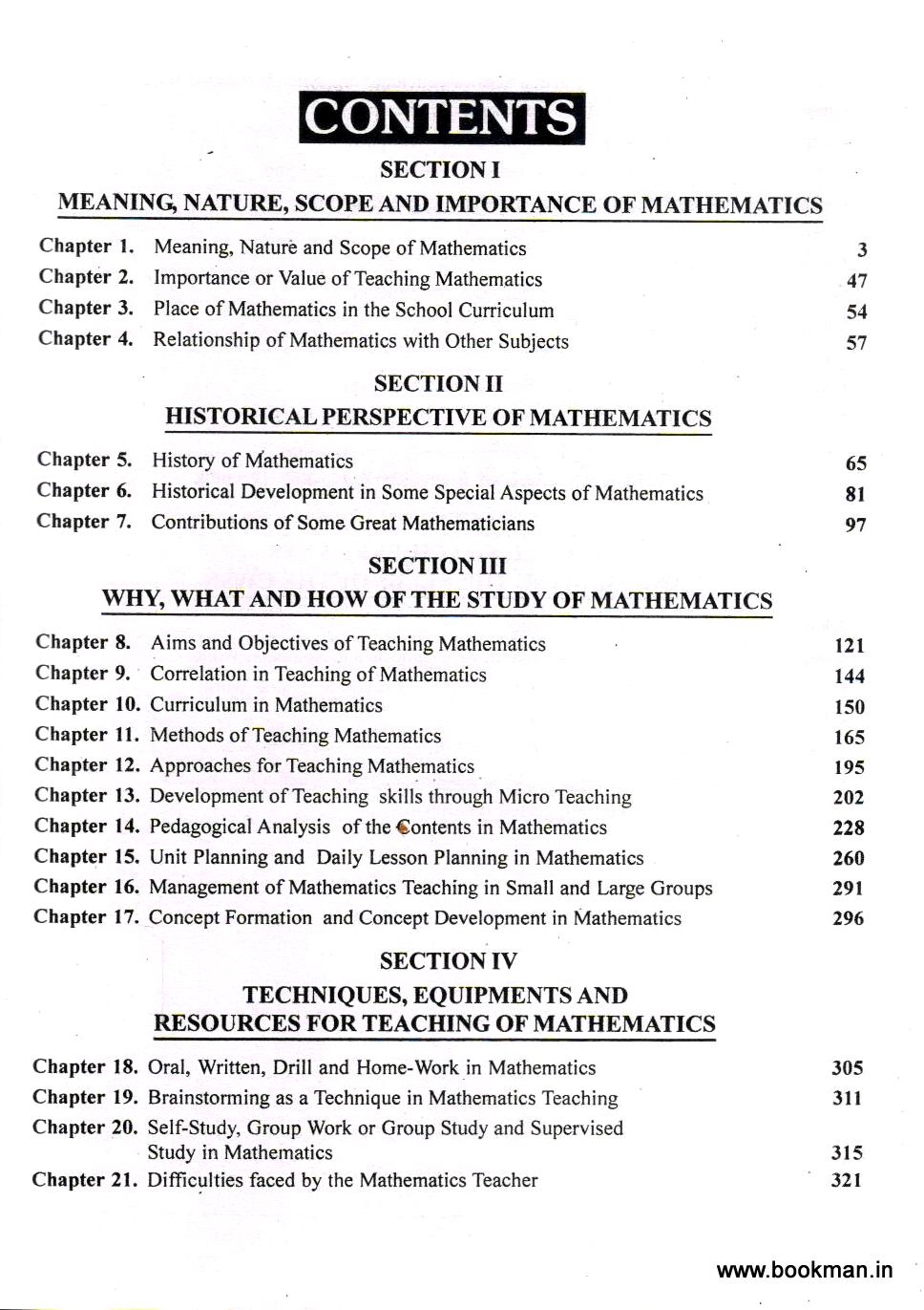 In its present modified and expanded form the subject matter related to 41 chapters of this text has been compactly organized into five different sections. Now with its wide coverage and clear perception, the text is adequately capable of providing essential knowledge, skills, attitude and interest for the teachers of mathematics at their pre-service or in-service stages needed for their professional preparation as well as development.