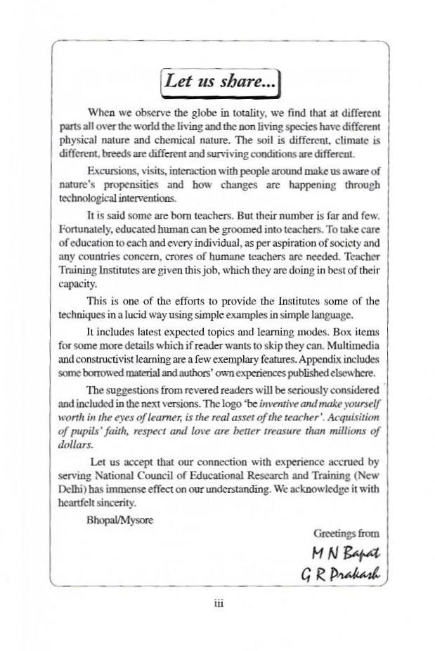 Let us accept that our connection with experience accrued by serving National Council of Educational Research and Training (New Delhi) has immense effect on our understanding. We acknowledge it with heartfelt sincerity.