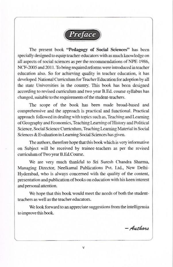 The present book “Pedagogy of Social Sciences” has been specially designed to equip teacher-educators with as much knowledge on all aspects of social sciences as per the recommendations of NPE-1986, NCF-2005 and 2011. To bring required reforms were introduced in teacher education also. So for achieving quality in teacher education, it has developed National Curriculum for Teacher Education for adoption by all the state Universities in the country. This book has been designed according to revised curriculum and two year B.Ed. course syllabus has changed, suitable to the requirements of the student-teachers.