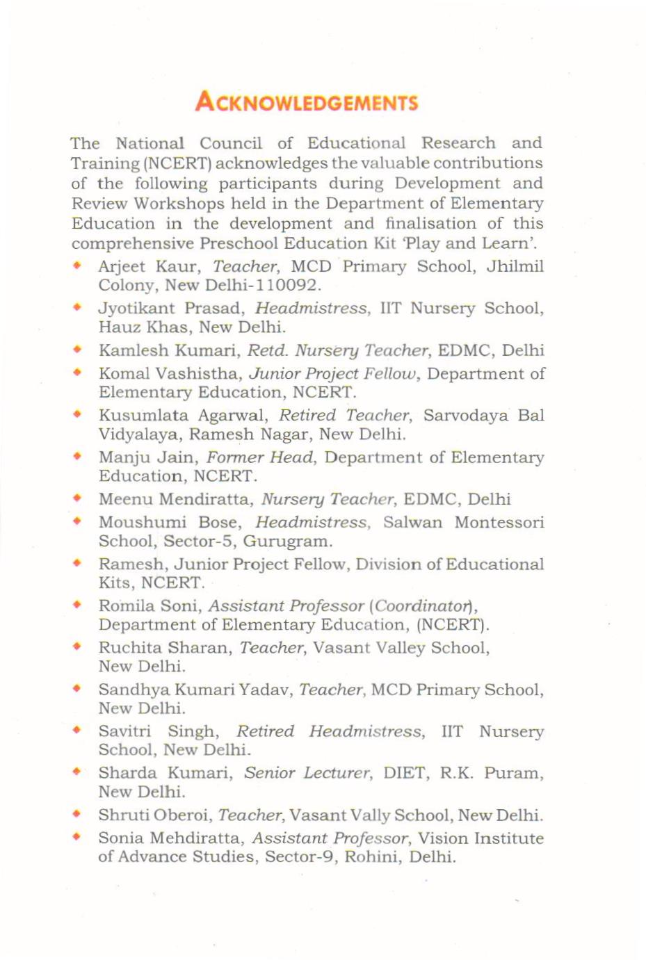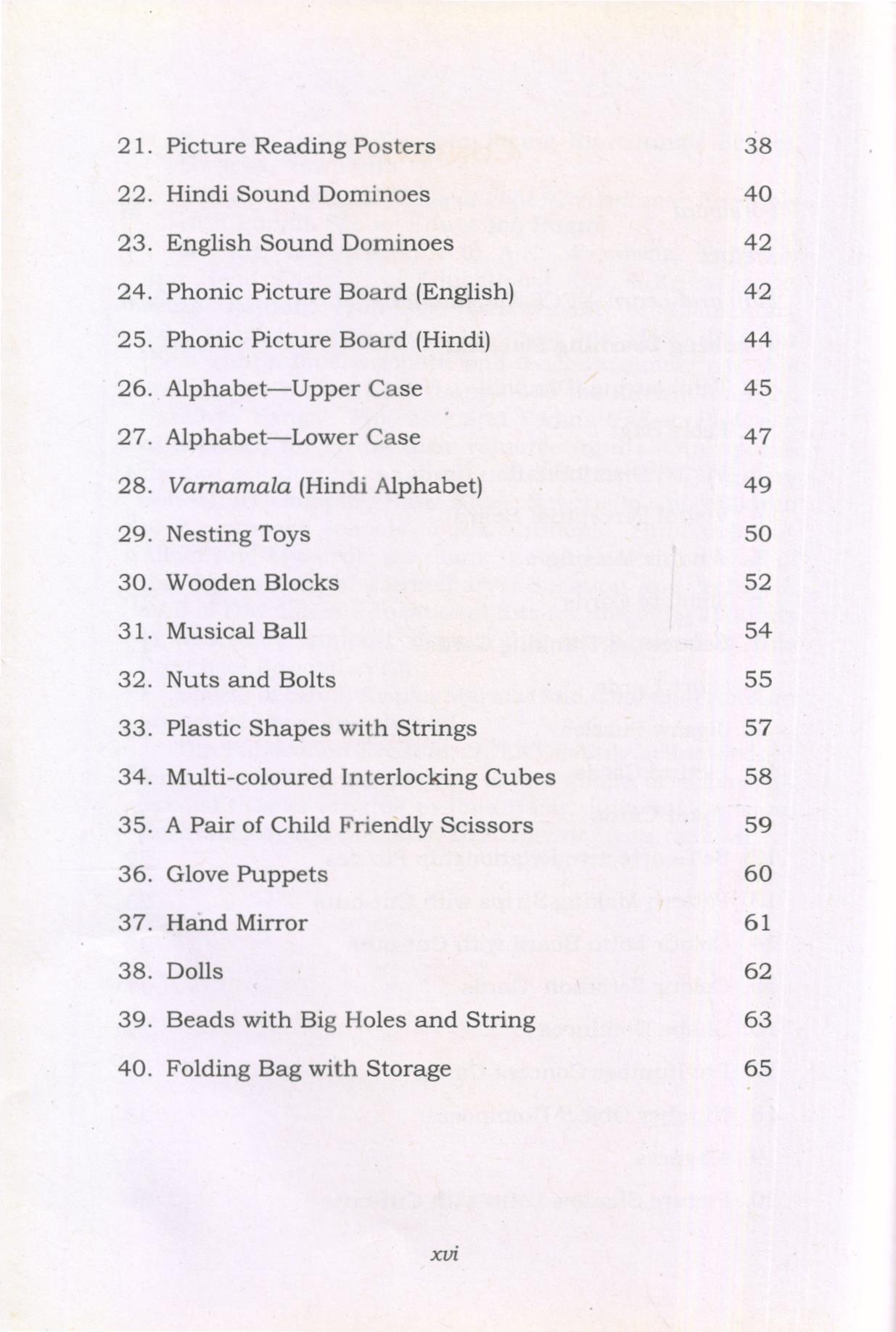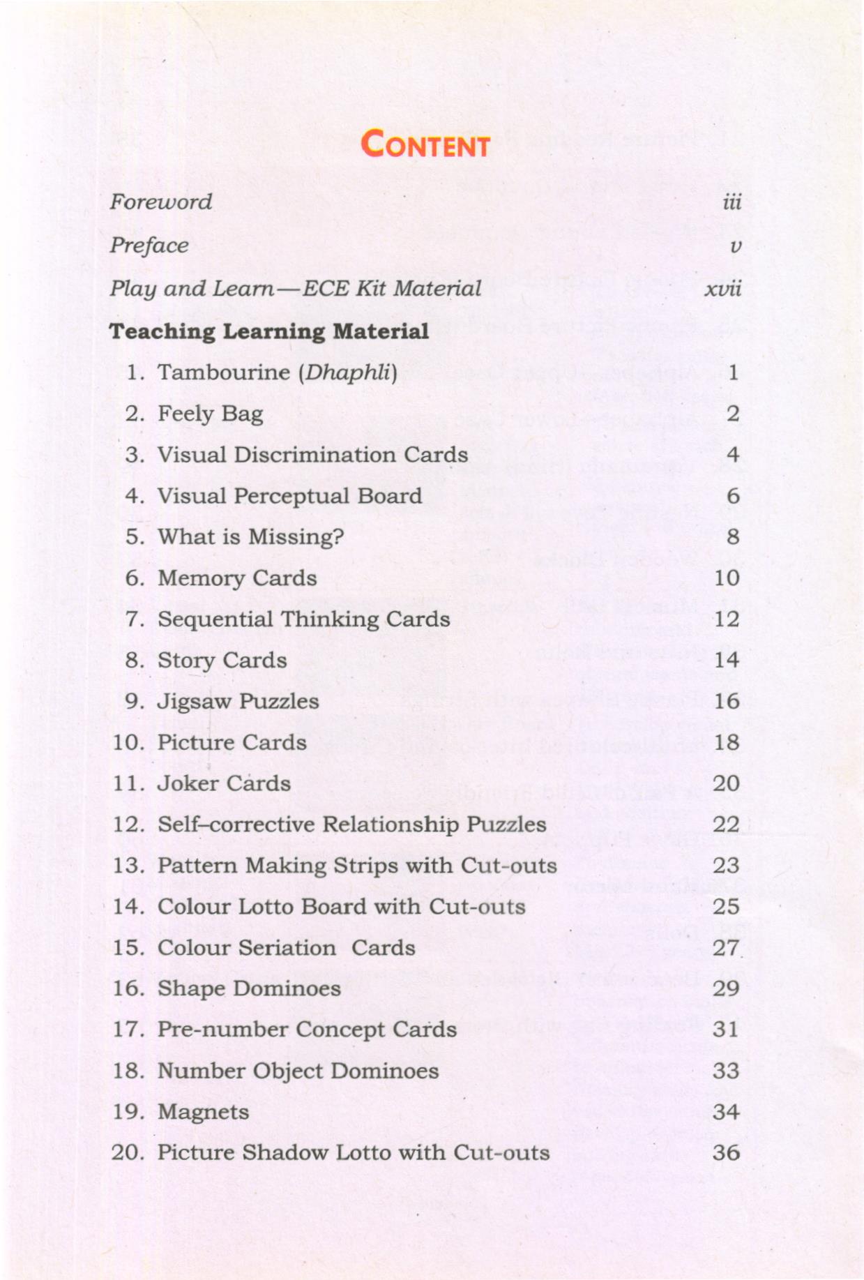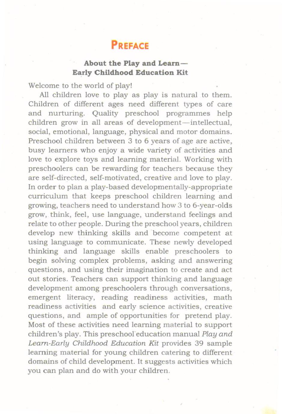 All children love to play as play is natural to them. Children of different ages need different types of care and nurturing. Quality preschool programmes help children grow in all areas of development-intellectual, social, emotional, language, physical and motor domains. Preschool children between 3 to 6 years of age are active, busy learners who enjoy a wide variety of activities and love to explore toys and learning material. Working with preschoolers can be rewarding for teachers because they are self-directed, self-motivated, creative and love to play. In order to plan a play-based developmentally-appropriate curriculum that keeps preschool children learning and growing, teachers need to understand how 3 to 6-year-olds grow, think, feel, use language, understand feelings and relate to other people. During the preschool years, children develop new thinking skills and become competent at using language to communicate. These newly developed thinking and language skills enable preschoolers to begin solving complex problems, asking and answering questions, and using their imagination to create and act out stories. Teachers can support thinking and language development among preschoolers through conversations, emergent literacy, reading readiness activities, math readiness activities and early science activities, creative questions, and ample of opportunities for pretend play. Most of these activities need learning material to support children’s play. This preschool education manual Play and Learn-Early Childhood Education Kit provides 39 sample learning material for young children catering to different domains of child development. It suggests activities which you can plan and do with your children.