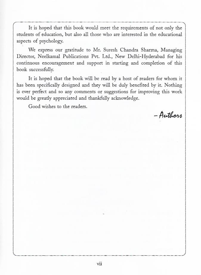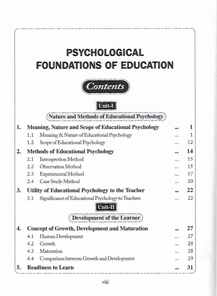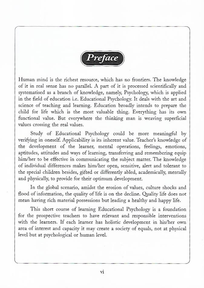 Psychological Foundations of Education deals with the art and science of teaching and learning. Study of Psychological Foundations of Education could be more meaningful by introspecting oneself. Teacher’s knowledge of the development of the learner, mental operations, feelings, emotions, aptitudes, attitudes and ways of learning and transferring and remembering equip him/her to be effective in communicating the subject matter. The knowledge of individual differences makes him/her open, sensitive, alert and tolerant to the special children besides, gifted or handicapped to provide for their optimum development academically, mentally and physically. In the global scenario, amidst the erosion of values, culture shocks and flood of information, the quality of life is on the decline. Quality life does not mean having rich material possessions but leading a healthy and happy life. This short course of Psychological Foundations of Education is a foundation for the prospective teachers to have relevant and responsible interventions with the learners. If each learner has holistic development in his/her own area of interest and capacity, it may create a society of equals, not at physical level but at psychological & human level.