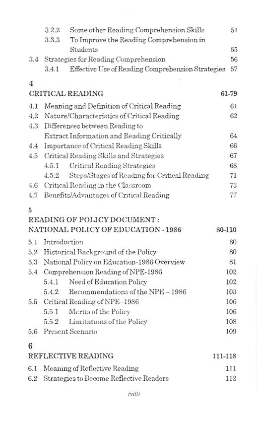 It is generally seen that in our education colleges, pupil teachers are not given to reading widely, which limits their knowledge disastrously, having adverse impact on their professional excellence. This subject will help the popul-teachers to understand and undertake the study of different types of texts with a purpose of comprehensive and critical reviews for overall interpretation and adaptation.