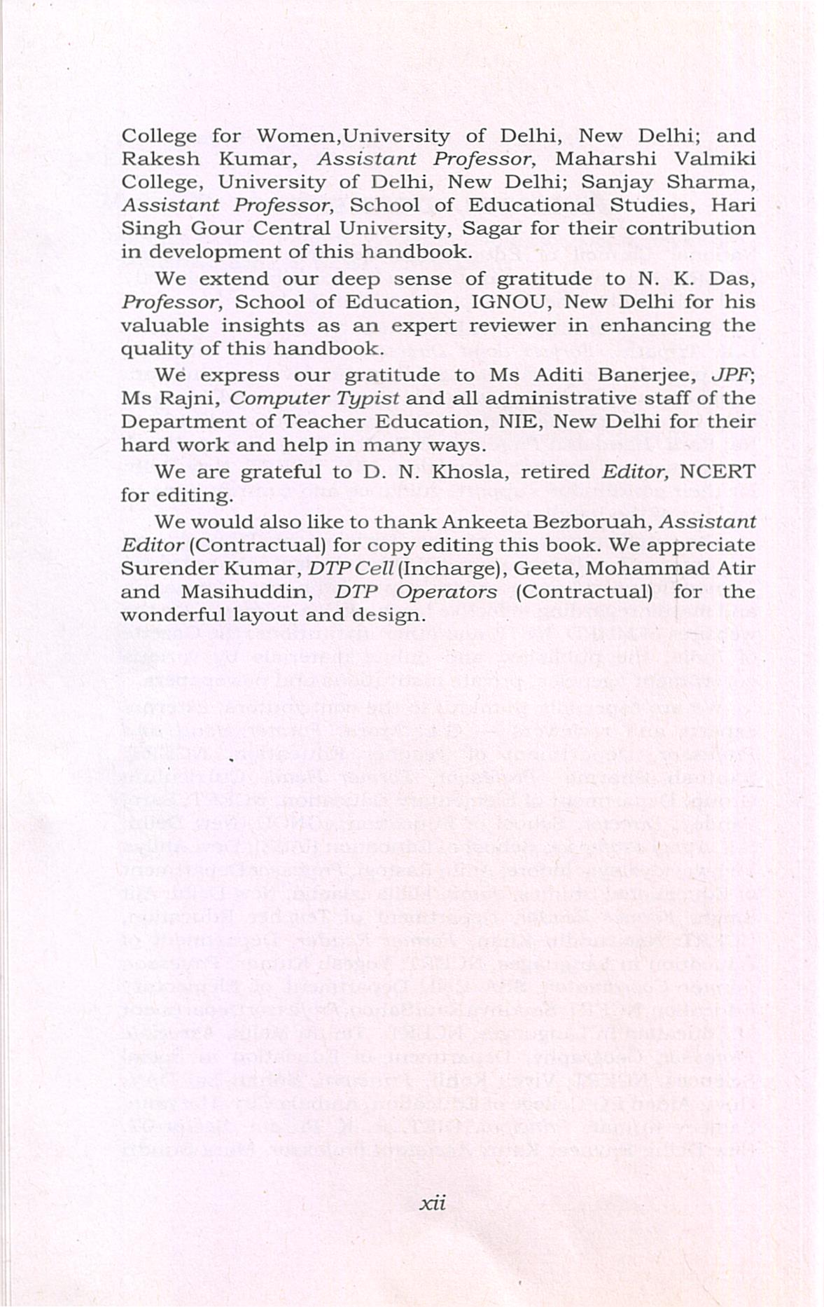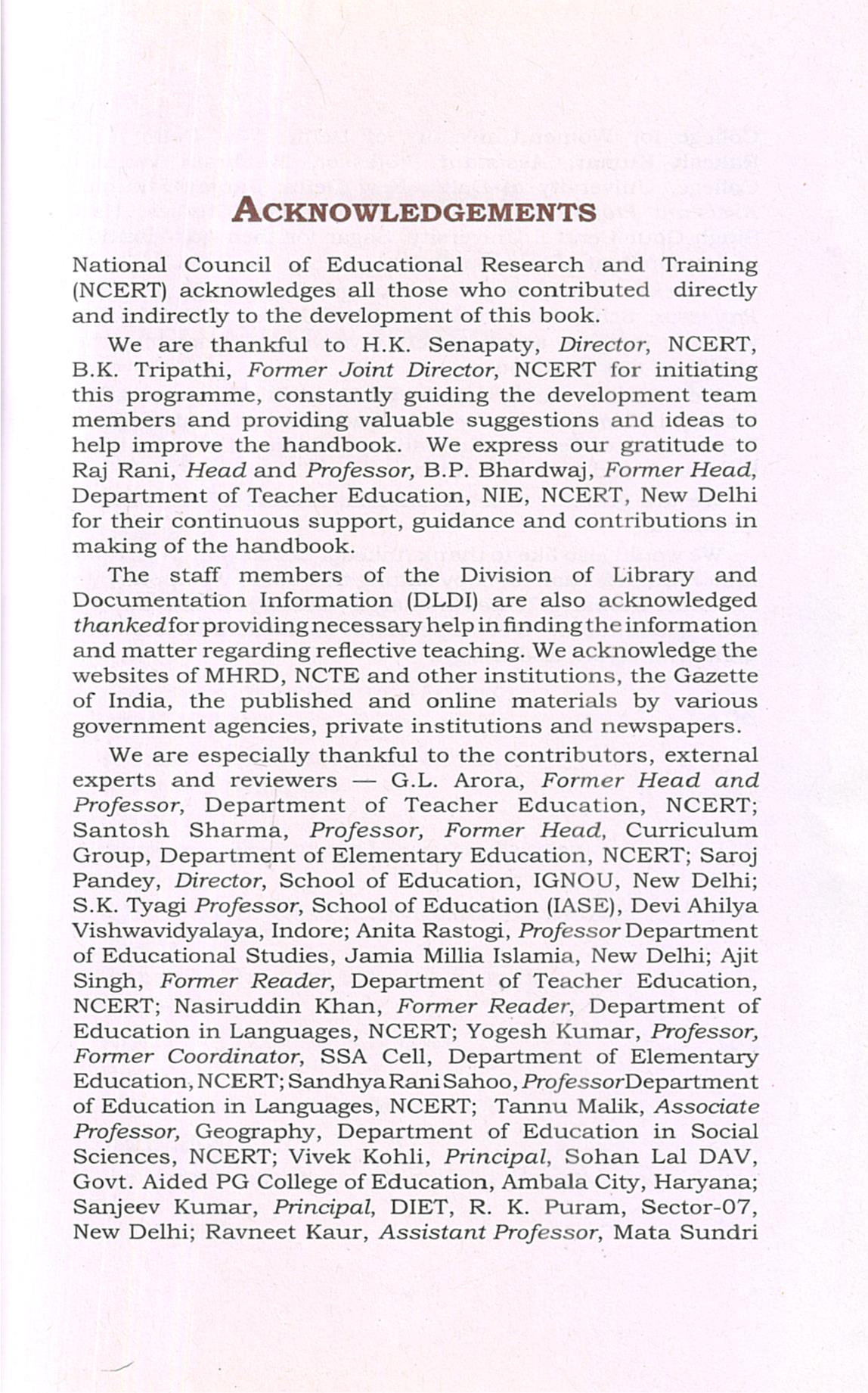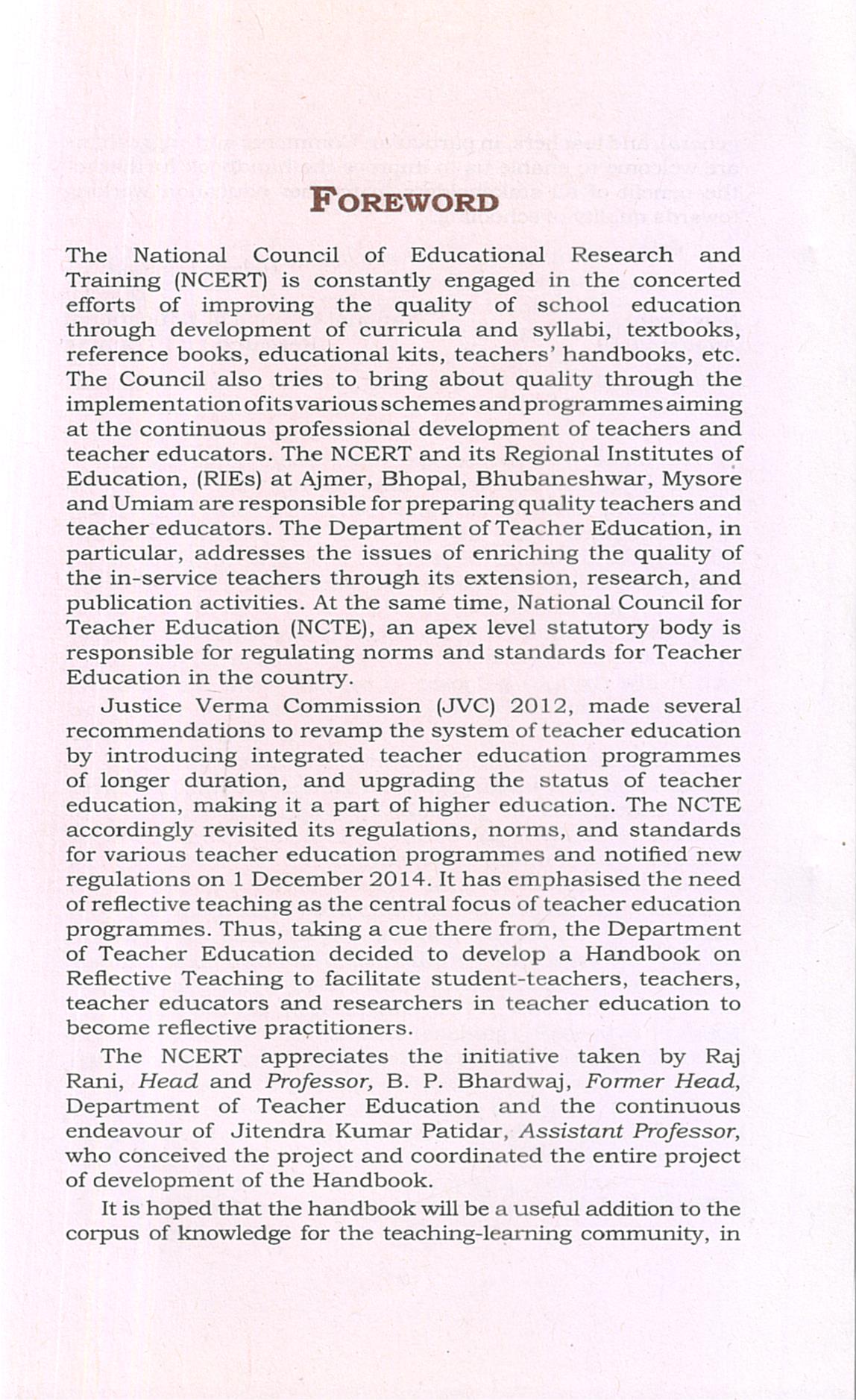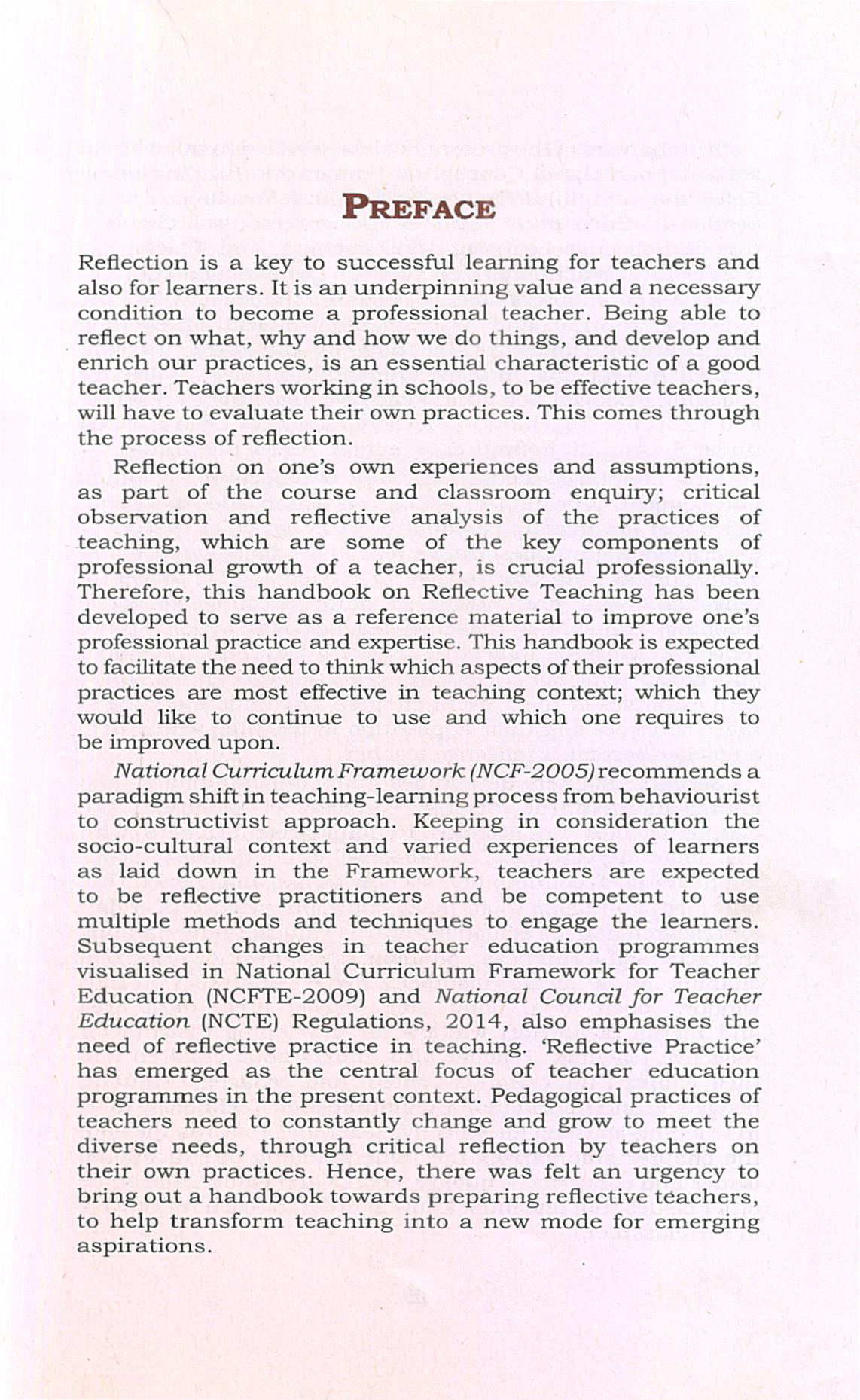 National Curriculum Framework (NCF-2005) recommends a paradigm shift in the teaching-learning process from a behaviourist to a constructivist approach. Keeping in consideration the socio-cultural context and varied experiences of learners as laid down in the Framework, teachers are expected to be reflective practitioners and be competent to use multiple methods and techniques to engage the learners. Subsequent changes in teacher education programmes visualised in the National Curriculum Framework for Teacher Education (NCFTE-2009) and National Council for Teacher Education (NCTE) Regulations, 2014, also emphasise the need for reflective practice in teaching. ‘Reflective Practice’ has emerged as the central focus of teacher education programmes in the present context. Pedagogical practices of teachers need to constantly change and grow to meet the diverse needs through critical reflection by teachers on their own practices. Hence, there was an urgency to bring out a handbook towards preparing reflective teachers to help transform teaching into a new mode for emerging aspirations.