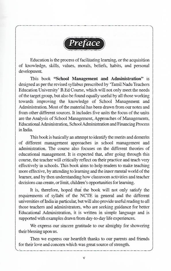 This book “School Management and Administration” is designed as per the revised syllabus prescribed by “Tamil Nadu Teachers Education University’ B.Ed Course, which will not only meet the needs of the target group, but also be found equally useful by all those working towards improving the knowledge of School Management and Administration. Most of the material has been drawn from our notes and from other different sources. It includes five units the focus of the units are the Analysis of School Management, Approaches of Managements, Educational Administration, School Administration and Financing Process in India.