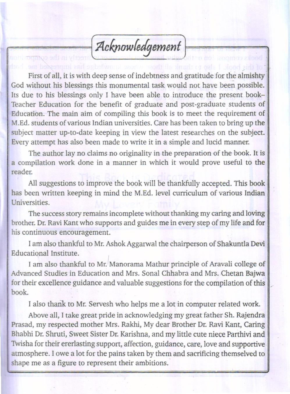 I am also thankful to Mr. Manorama Mathur principle of Aravali college of Advanced Studies in Education and Mrs. Sonal Chhabra and Mrs. Chetan Bajwa for their excellence guidance and valuable suggestions for the compilation of this book.