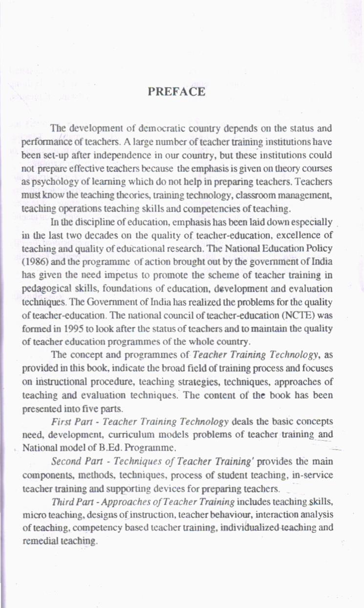 The development of democratic country depends on the status and performance of teachers. A large number of teacher training institutions have been set-up after independence in our country, but these institutions could not prepare effective teachers because the emphasis is given on theory courses as psychology of learning which do not help in preparing teachers. Teachers must know the teaching theories, training technology, classroom management, teaching operations teaching skills and competencies of teaching.