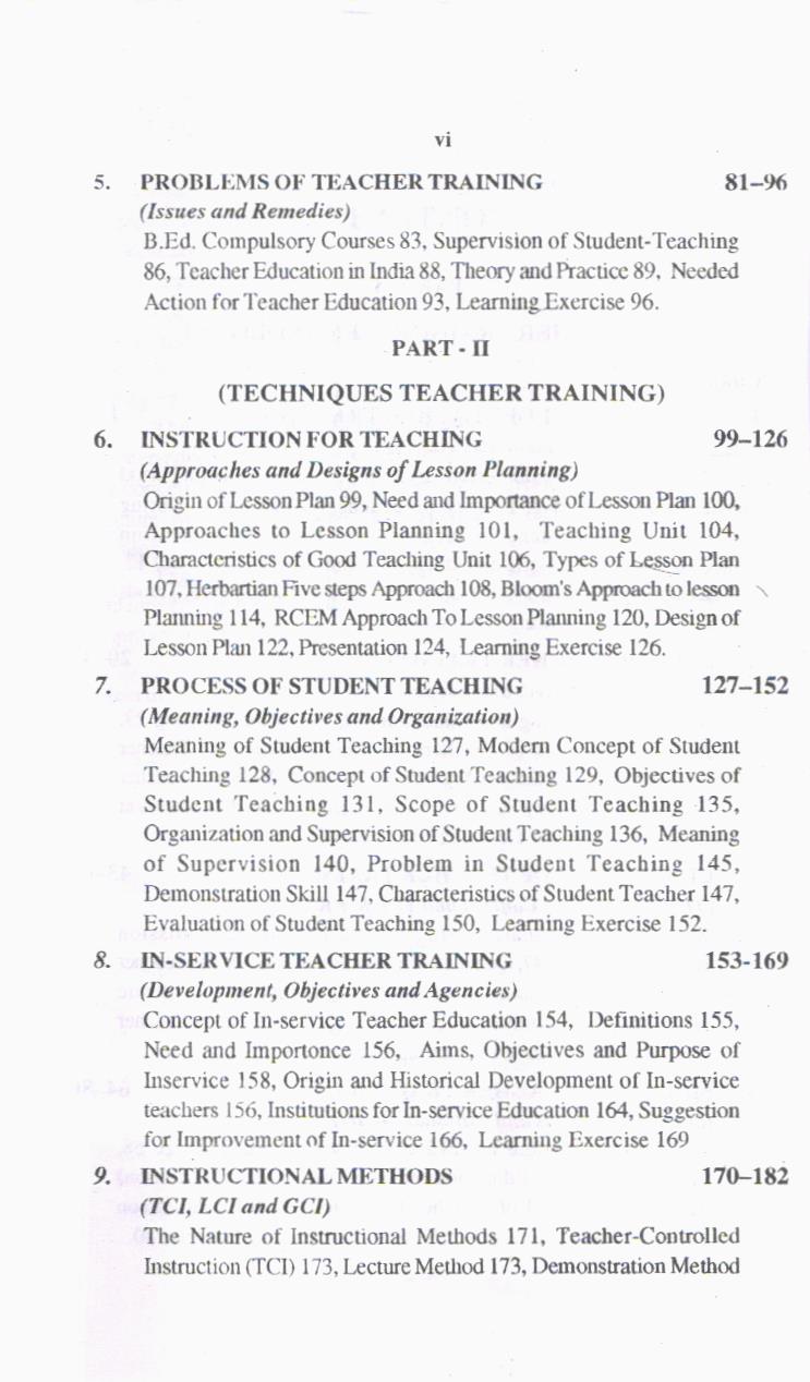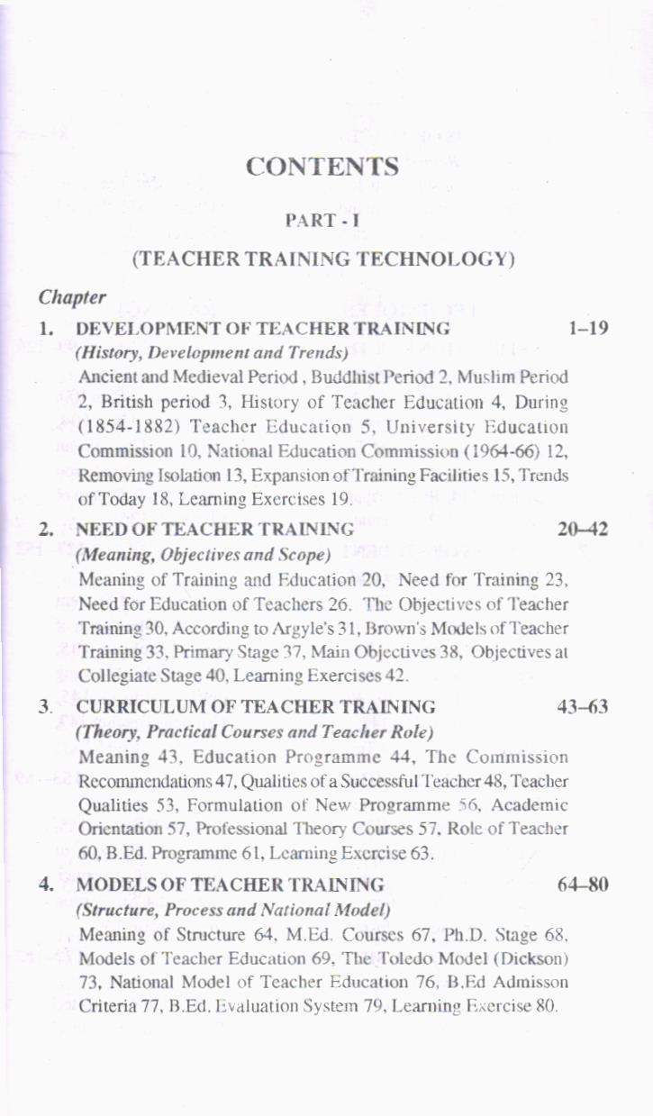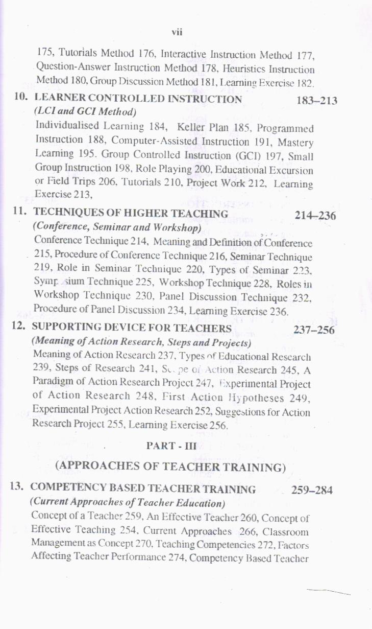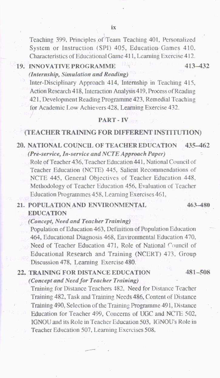 Third Part – Approaches of Teacher Training includes teaching skills, micro teaching, designs of instruction, teacher behaviour, interaction analysis of teaching, competency based teacher training, individualized teaching and remedial teaching.