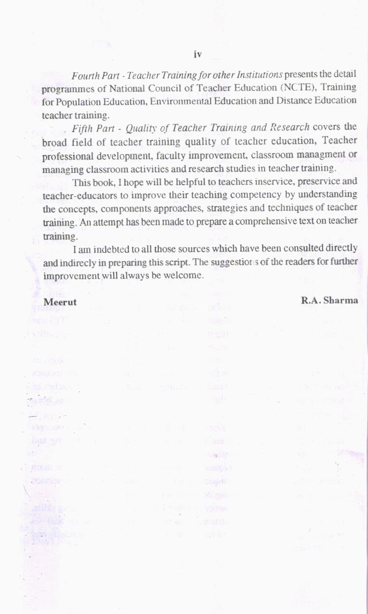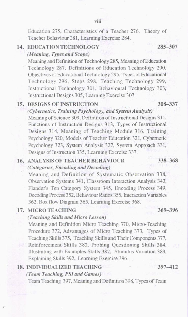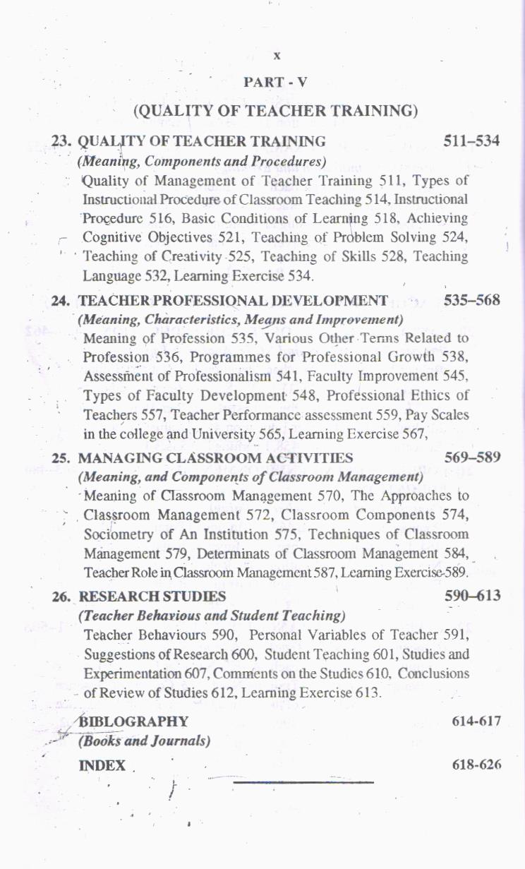 Third Part – Approaches of Teacher Training includes teaching skills, micro teaching, designs of instruction, teacher behaviour, interaction analysis of teaching, competency based teacher training, individualized teaching and remedial teaching.