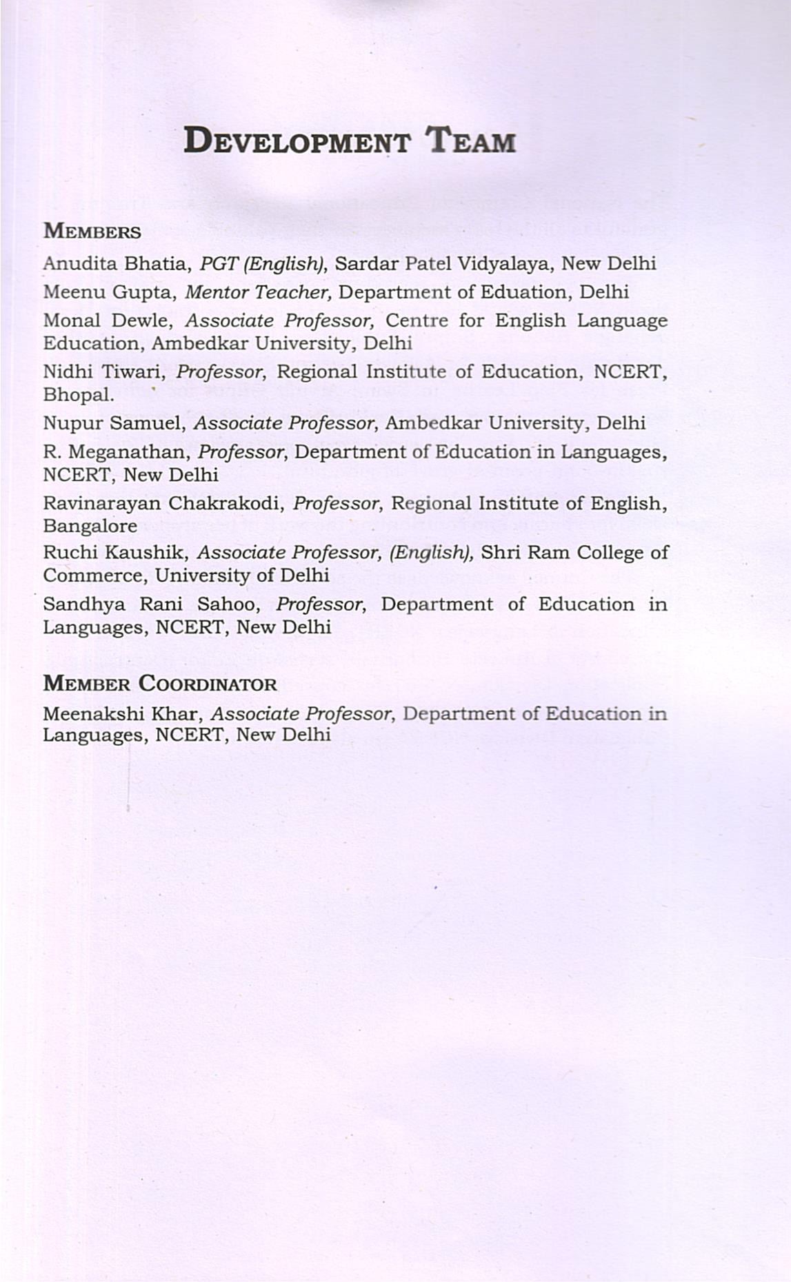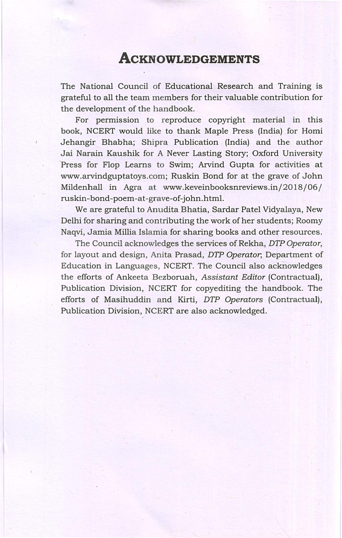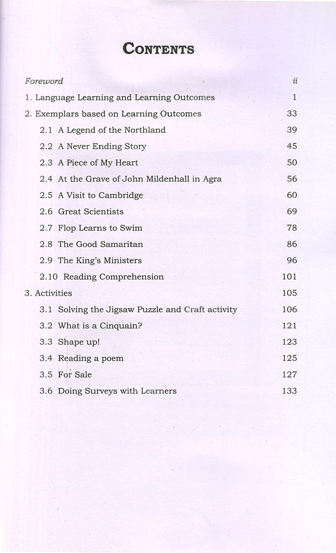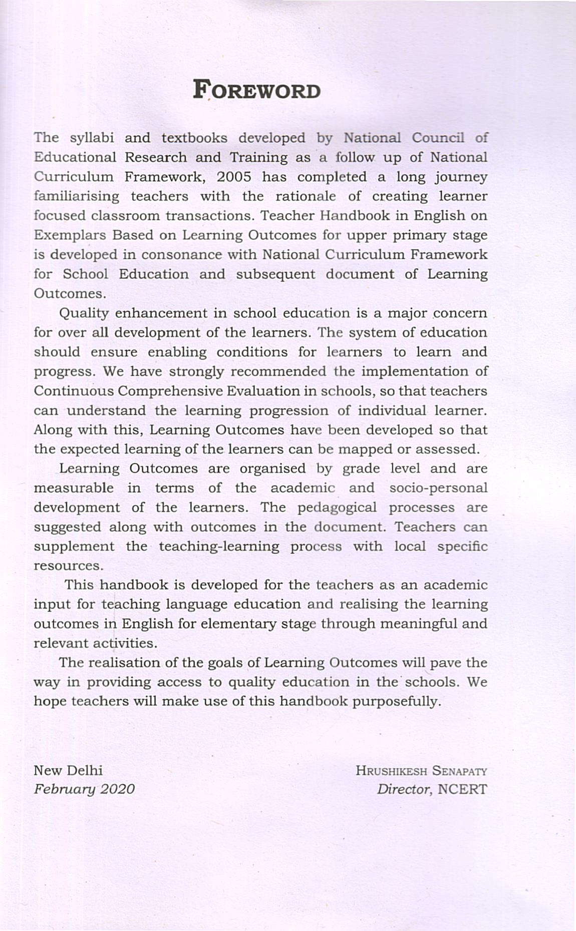 The syllabi and textbooks developed by National Council of Educational Research and Training as a follow up of National Curriculum Framework, 2005 has completed a long journey familiarising teachers with the rationale of creating learner focused classroom transactions. Teacher Handbook in English on Exemplars Based on Learning Outcomes for upper primary stage is developed in consonance with National Curriculum Framework for School Education and subsequent document of Learning Outcomes.