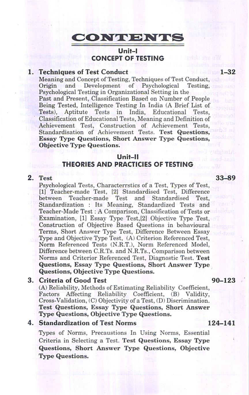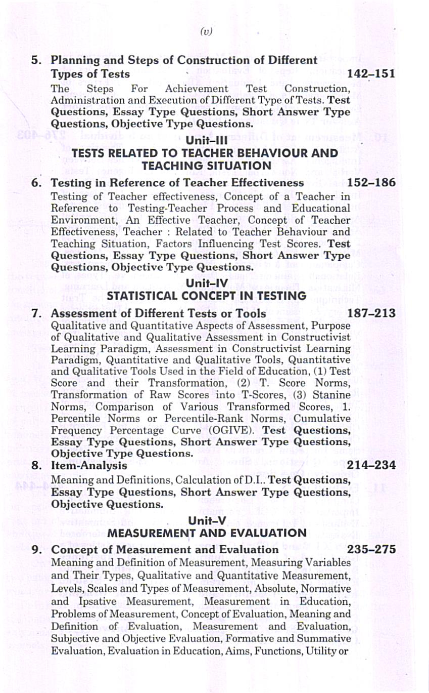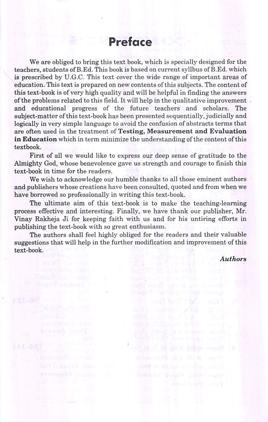 We are obliged to bring this text book, which is specially designed for the teachers, students of B.Ed. This book is based on current syllbus of B.Ed. which is prescribed by U.G.C. This text cover the wide range of important areas of education. This text is prepared on new contents of this subjects. The content of this text-book is of very high quality and will be helpful in finding the answers of the problems related to this field. It will help in the qualitative improvement and educational progress of the future teachers and scholars. The subject-matter of this text-book has been presented sequentially, judicially and logically in very simple language to avoid the confusion of abstracts terms that are often used in the treatment of Testing, Measurement and Evaluation in Education which in term minimize the understanding of the content of this textbook.