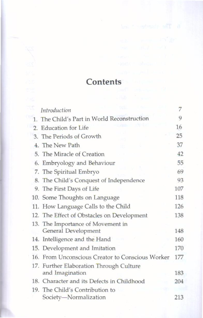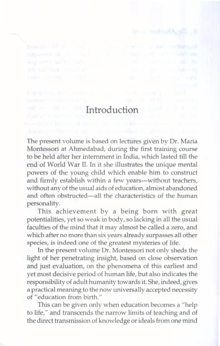 The present volume is based on lectures Dr. Maria Montessori gave at Ahmedabad during the first training course to be held after her internment in India, which lasted till the end of World War II. In it she illustrates the unique mental powers of the young child, which enable him to construct and firmly establish, within a few years, without teachers, without any of the usual aids of education, almost abandoned and often obstructed all the characteristics of the human personality