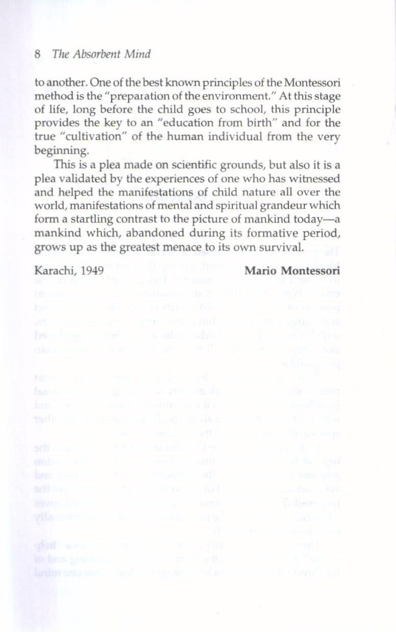 In the present volume, Dr. Montessori not only sheds the light of her penetrating insight, based on close observation and just evaluation, on the phenomena of this earliest and yet most decisive period of human life, but also indicates the responsibility of adult humanity towards it. She gives a practical meaning to the now universally accepted necessity of “education from birth.”