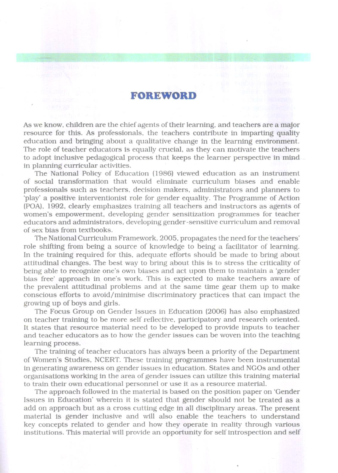 The Focus Group on Gender Issues in Education (2006) has also emphasized on teacher training to be more self reflective, participatory and research oriented. It states that resource material need to be developed to provide inputs to teacher and teacher educators as to how the gender issues can be woven into the teaching learning process.