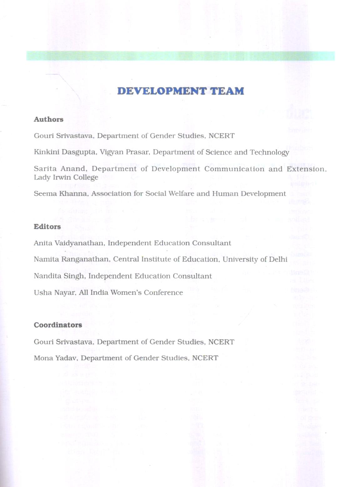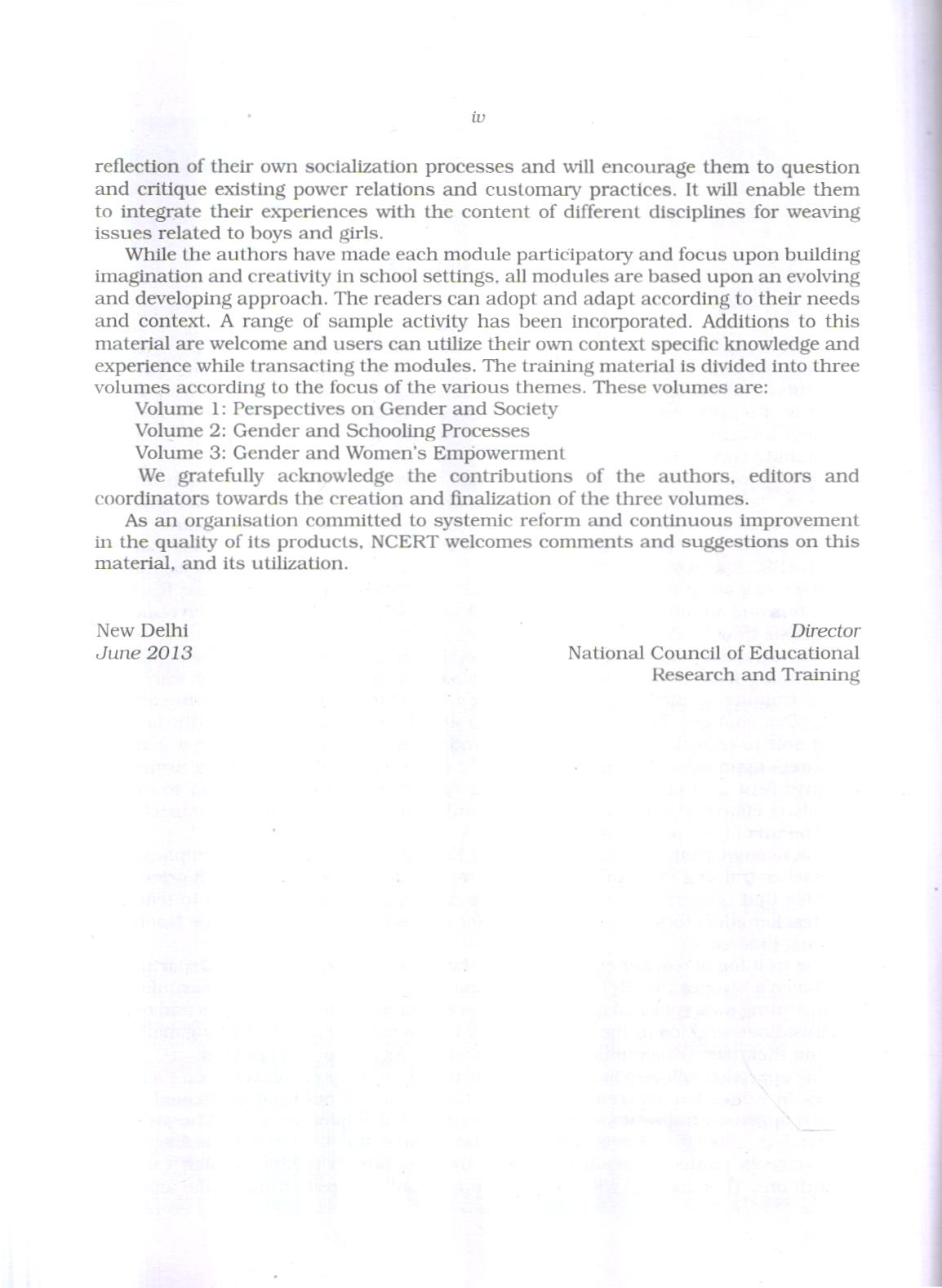 The training of teacher educators has always been a priority of the Department of Women’s Studies, NCERT. These training programmes have been instrumental in generating awareness on gender issues in education. States and NGOs and other organisations working in the area of gender issues can utilize this training material to train their own educational personnel or use it as a resource material.
