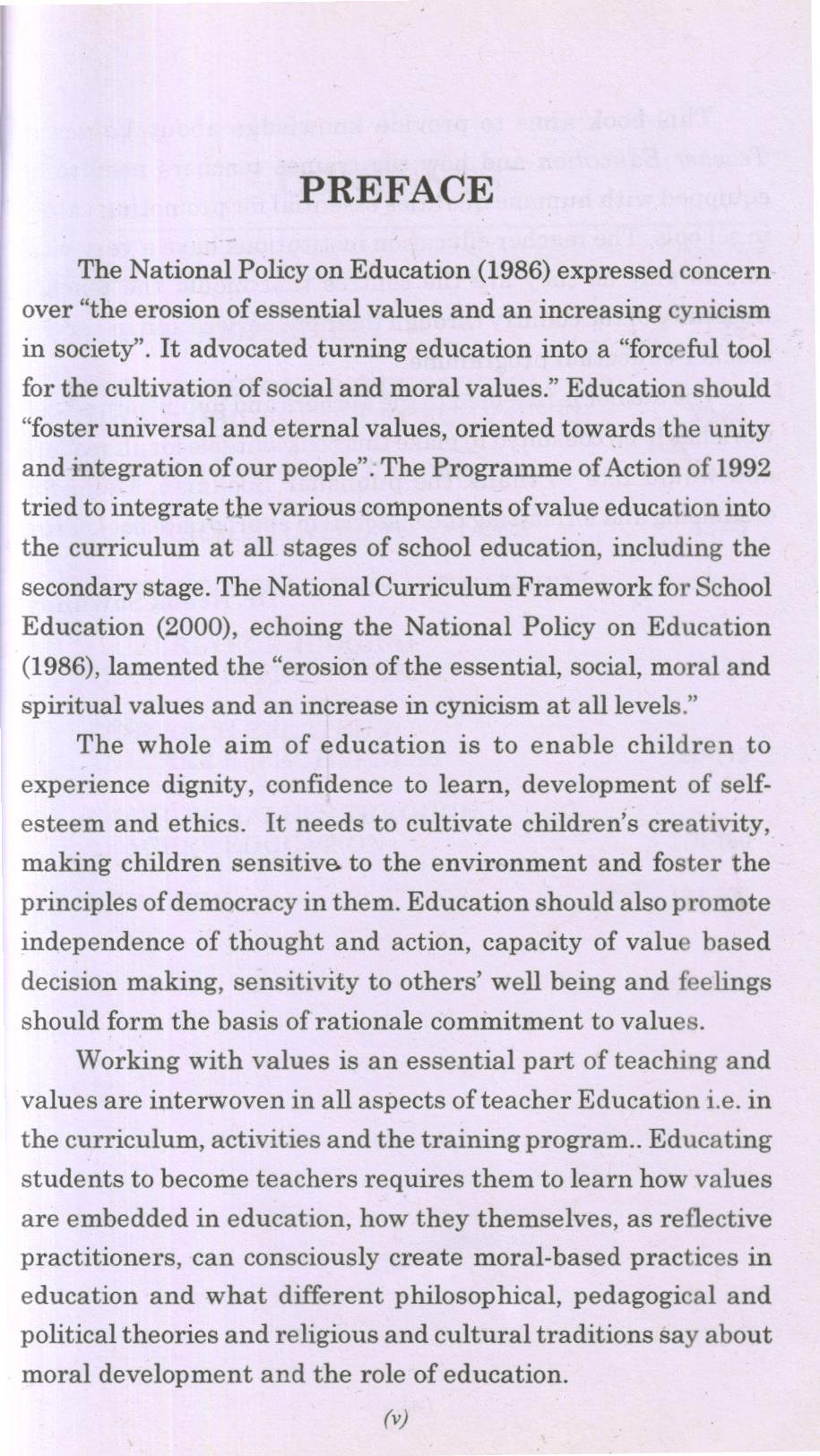 The National Policy on Education (1986) expressed concern over “the erosion of essential values and an increasing cynicism in society”. It advocated turning education into a “forceful tool for the cultivation of social and moral values.” Education should “foster universal and eternal values, oriented towards the unity and integration of our people”. The Programme of Action of 1992 tried to integrate the various components of value education into the curriculum at all stages of school education, including the secondary stage. The National Curriculum Framework for School Education (2000), echoing the National Policy on Education (1986), lamented the “erosion of the essential, social, moral and spiritual values and an increase in cynicism at all levels.”