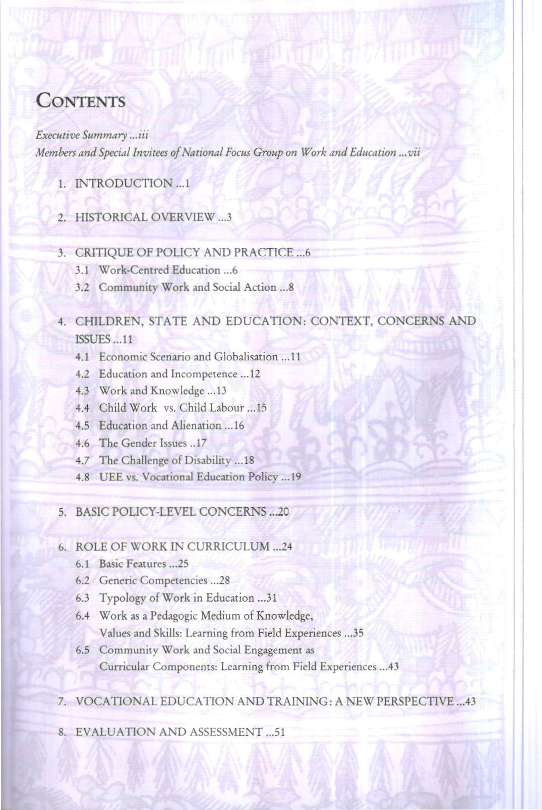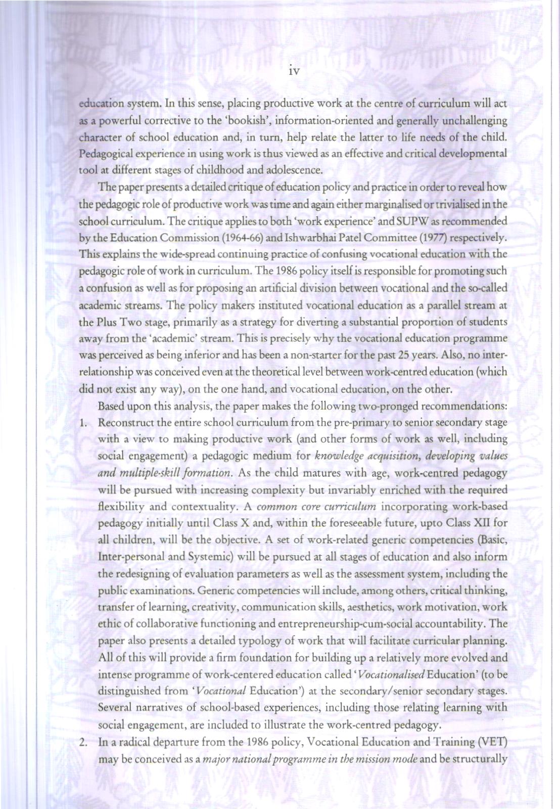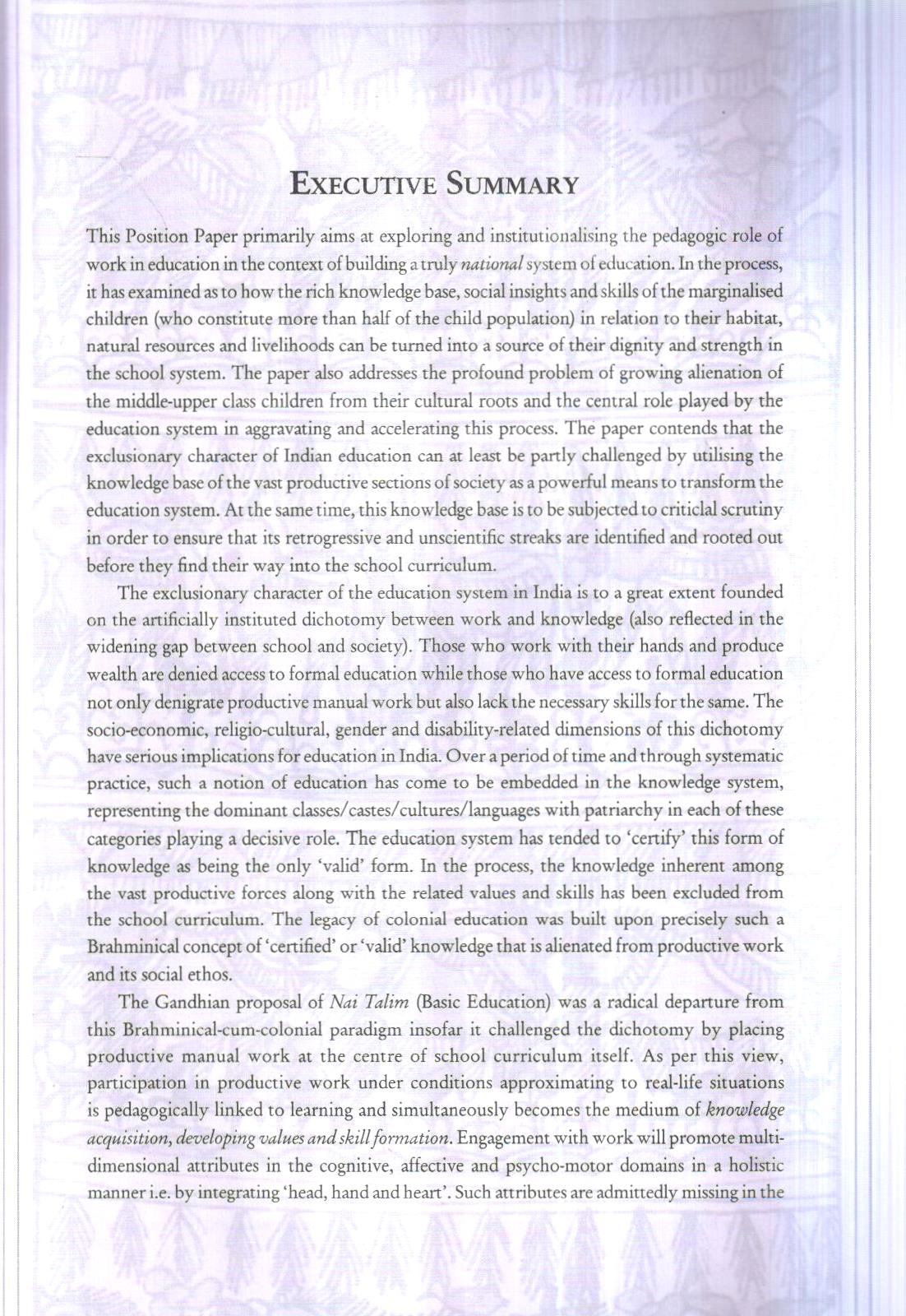 This Position Paper primarily aims at exploring and institutionalining the pedagogic role of work in education in the context of building a truly national system of education. In the process a has examined as to how the rich knowledge base, social insights and skidis of the marginalised children (who constitute more than half of the child population) in relation to their lubiar, natural resources and livelihoods can be turned into a source of their dignity and strength in the school system. The paper also addresses the profound problem of growing alienation of the middle-upper class children from their cultural roots and the central role played by the education system in aggravating and accelerating this process. The paper contends that the exclusionary character of Indian education can at least be partly challenged by stilining the knowledge base of the vast productive sections of society as a powerful means to transform the education system. At the same time, this knowledge base is to be subjected to critical scrutiny in order to ensure that its retrogressive and unscientific streaks are identified and rooted out before they find their way into the school curriculum.