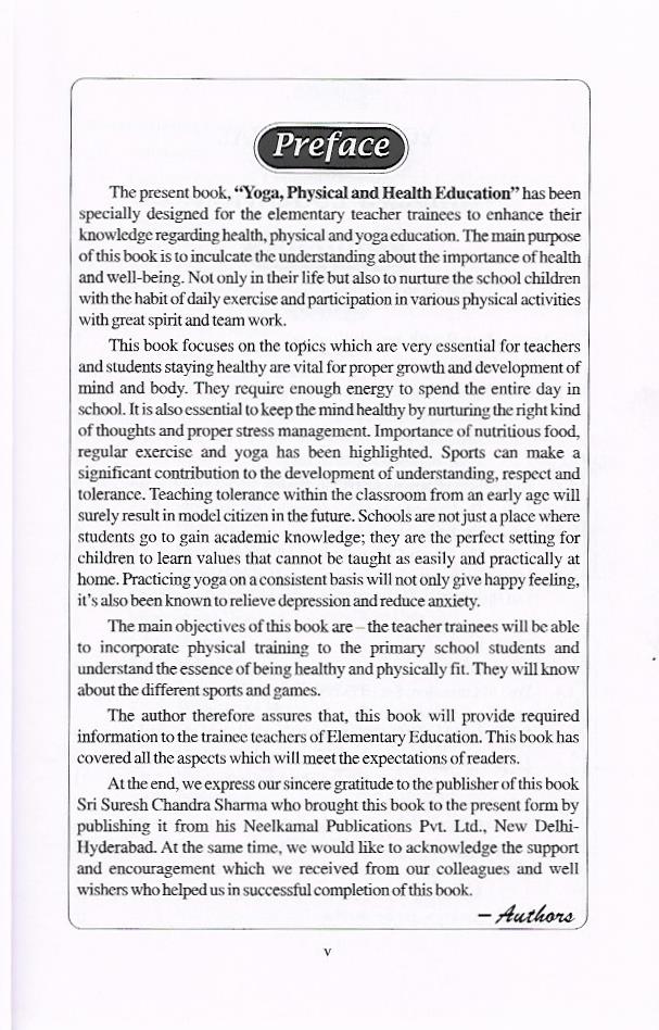 The present book, “Yoga, Physical and Health Education” has been specially designed for the elementary teacher trainees to enhance their knowledge regarding health, physical and yoga education. The main purpose of this book is to inculcate the understanding about the importance of health and well-being. Not only in their life but also to nurture the school children with the habit of daily exercise and participation in various physical activities with great spirit and team work.